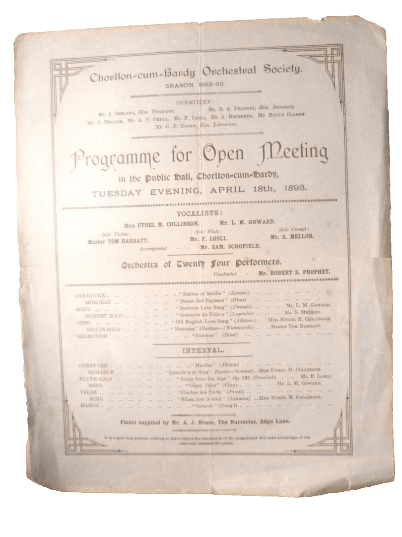 You are purchasing an original vintage more than 100 years old Concert programme of : Chorlton Orchestral Society 1893- PROGRAMME FOR OPEN MEETING at Public Hall, 18 April.