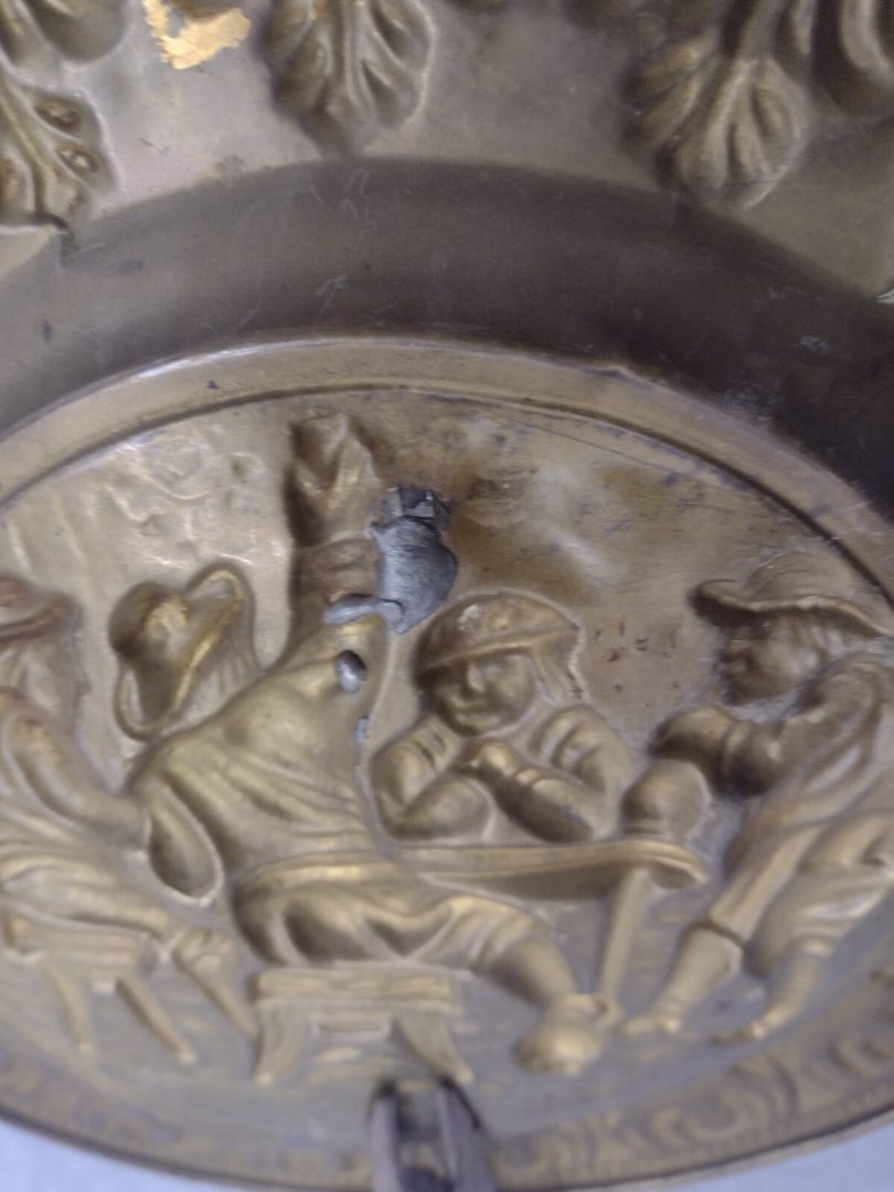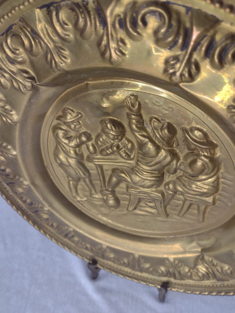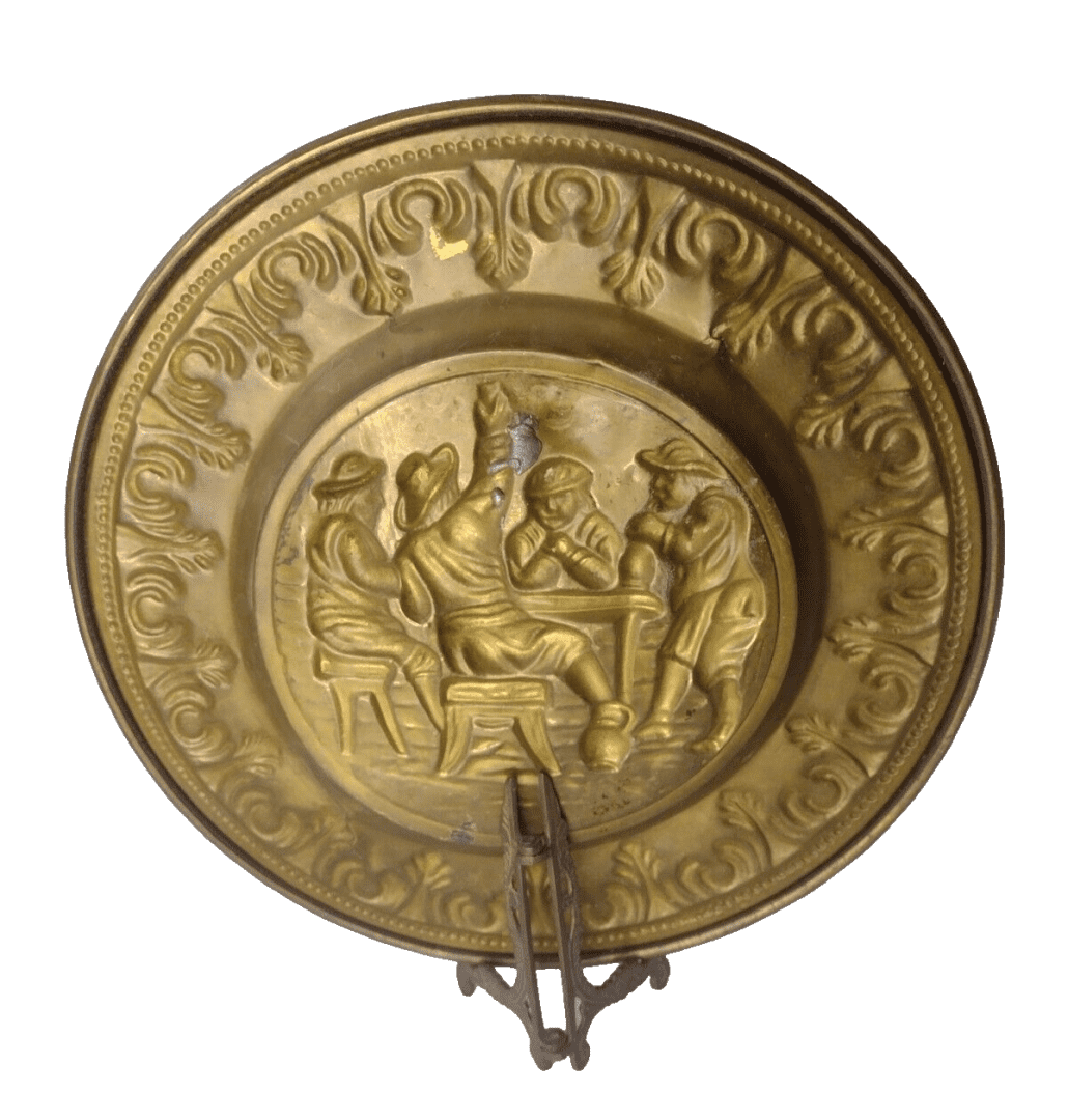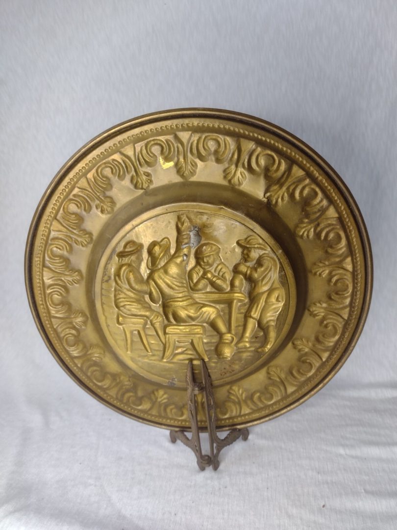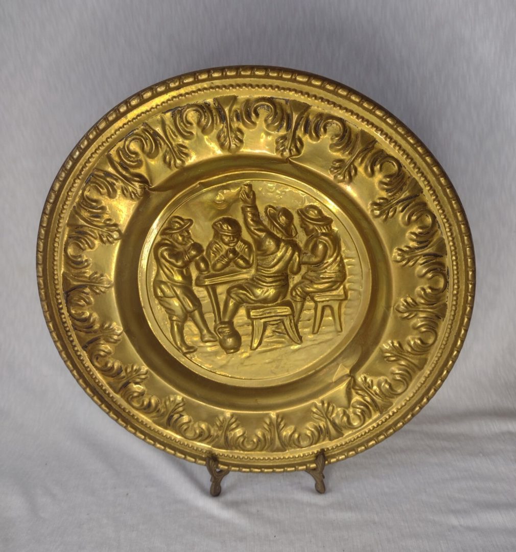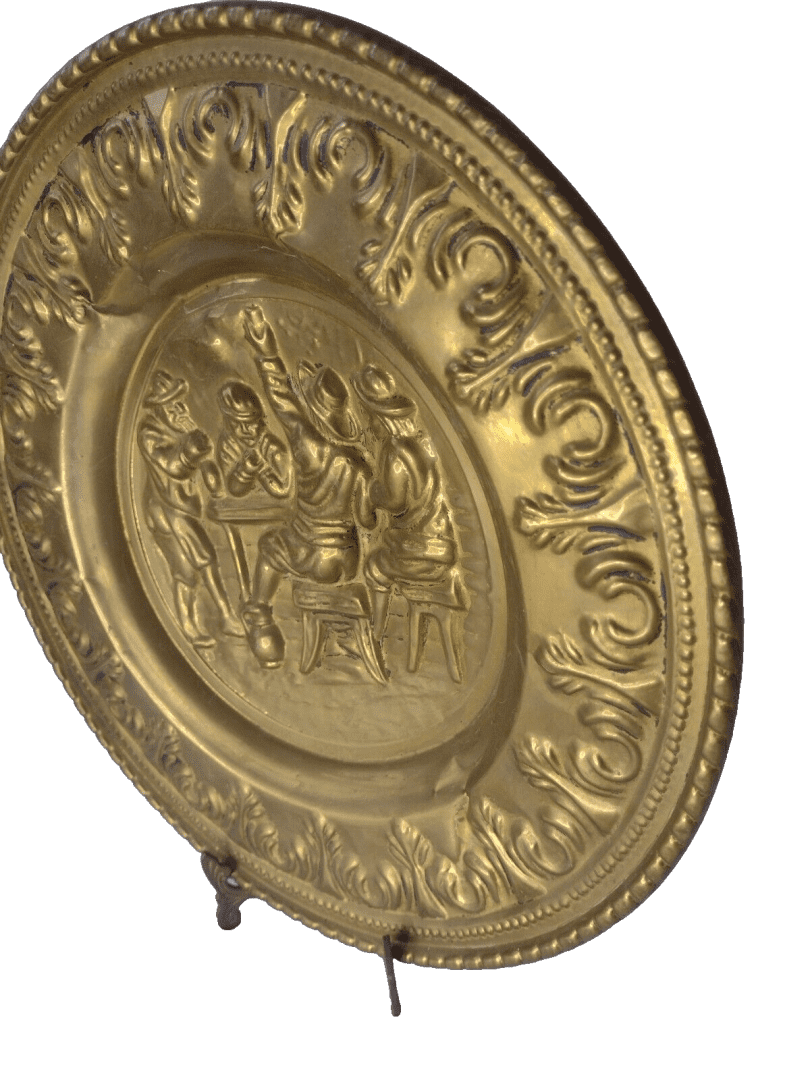 18th Century 3D Plate Display People Drinking Scene Solid Brass 29.5cm Antique