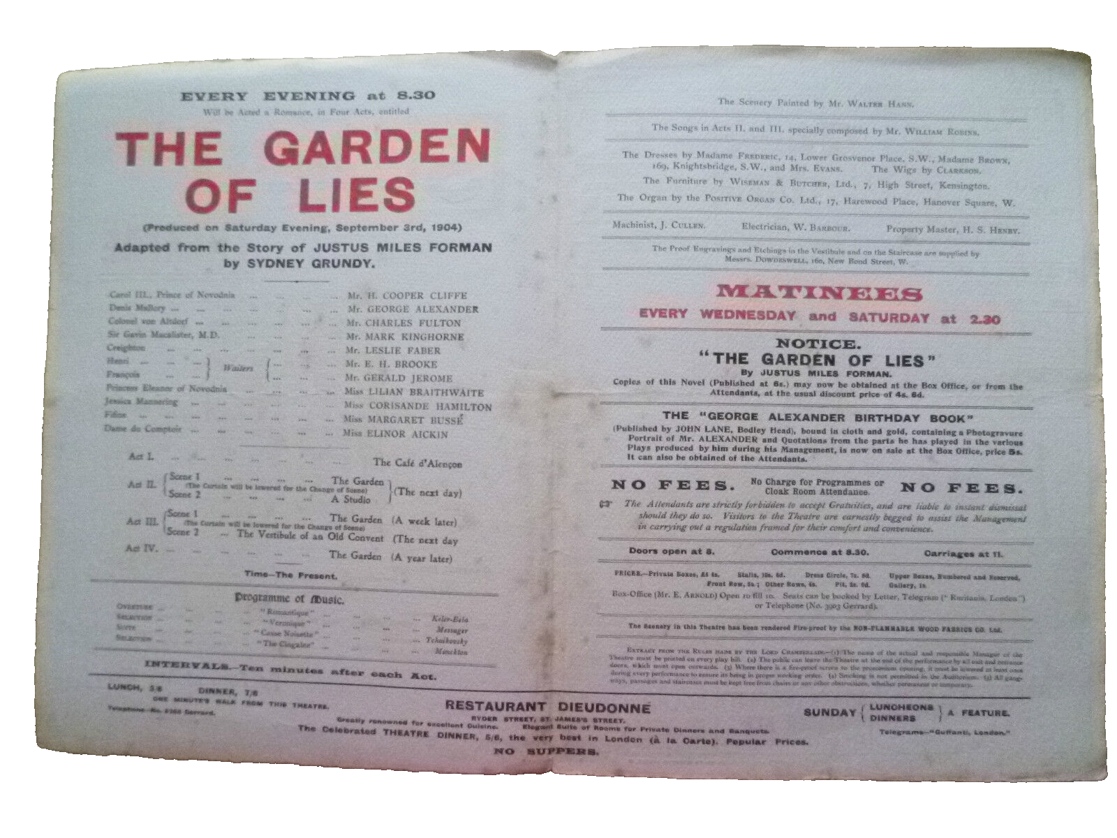 1904 Theatre Programme The Garden of Lies – Lilian Braithwaite H Cooper Cliffe