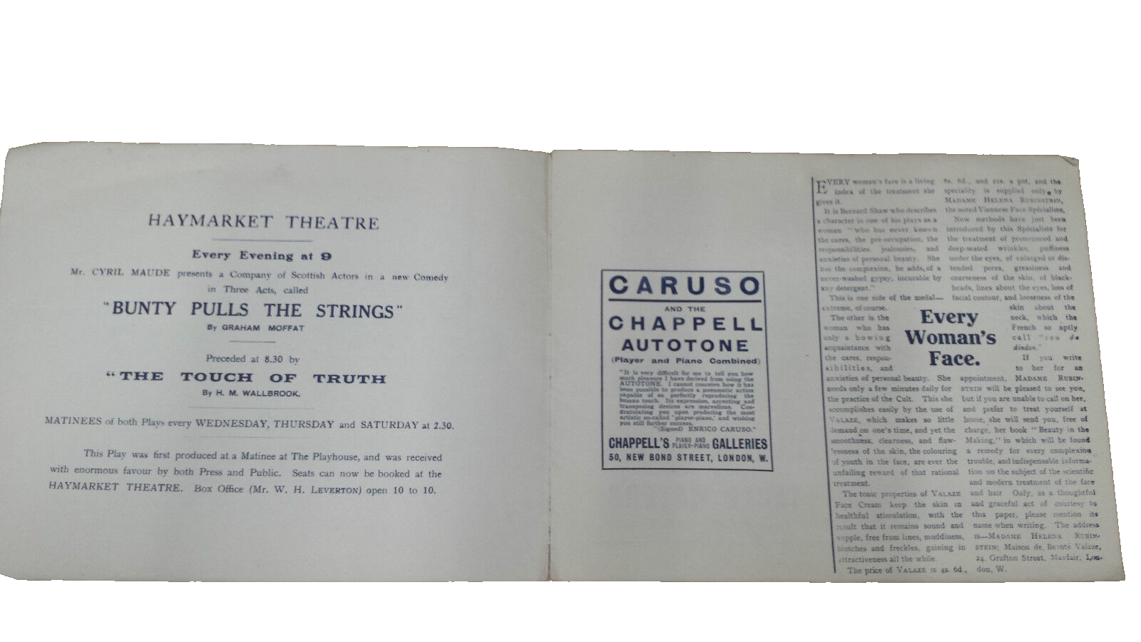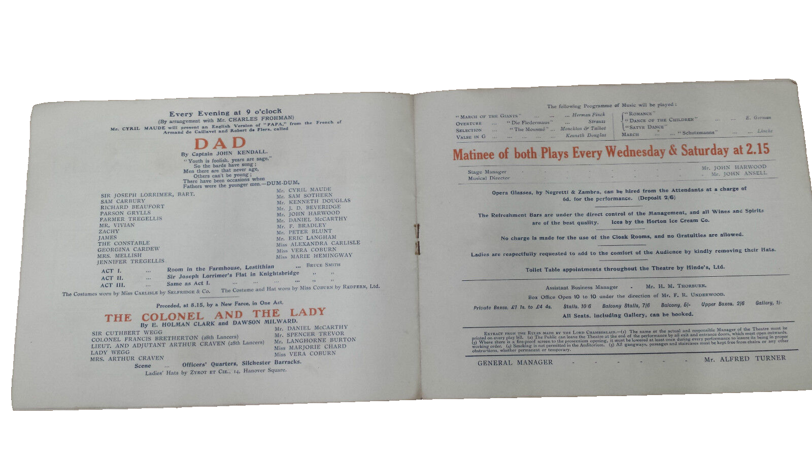 You are purchasing very collectable & original theatre programme of : This very rare over 110 years old Theatre programme from 1911 contains details of two plays Dad / The Colonel And The Lady . The Programme remains in very good condition for its age.