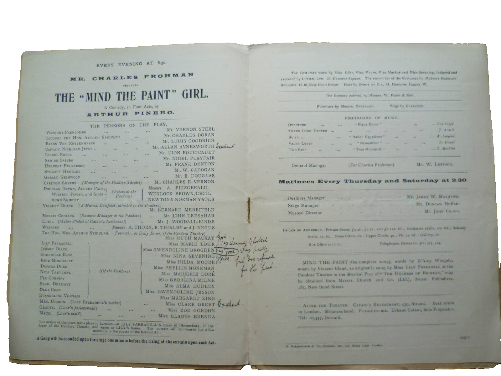 You are purchasing more than 100 years old an original vintage theatre programme: DUKE OF YORK’S THEATRE PROGRAMME 1912- THE MIND THE PAINT GIRL by Arthur Pinero
