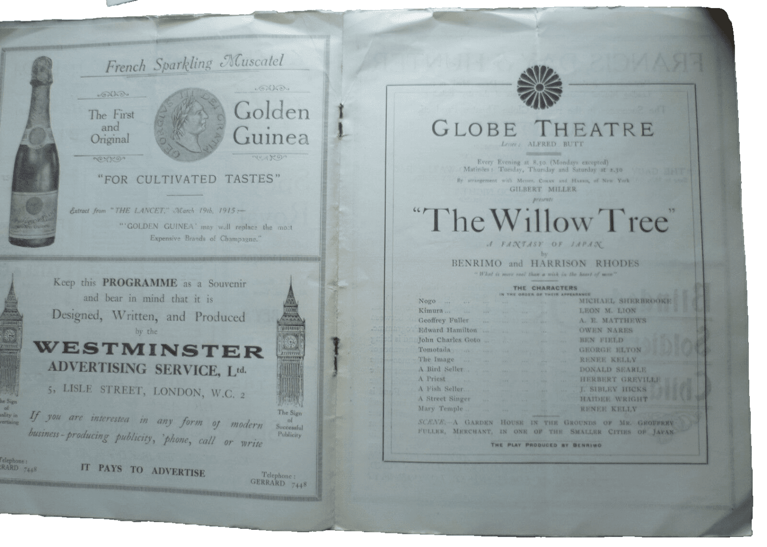 You are purchasing about 100 years old an original vintage very collectable Theatre programme from: GLOBE THEATRE PROGRAMME 1917-THE WILLOW TREE by Benrimo & Harrison Rhodes (RARE)