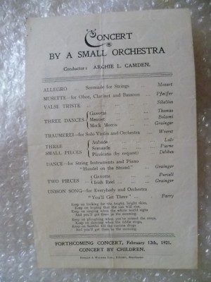 1921 Concert Programme Archie L Camden (by Small Orchestra)