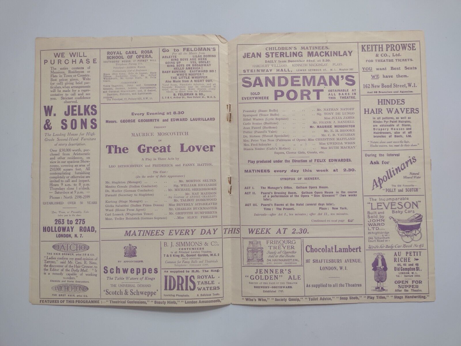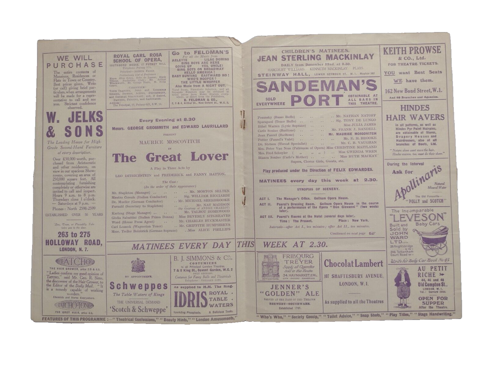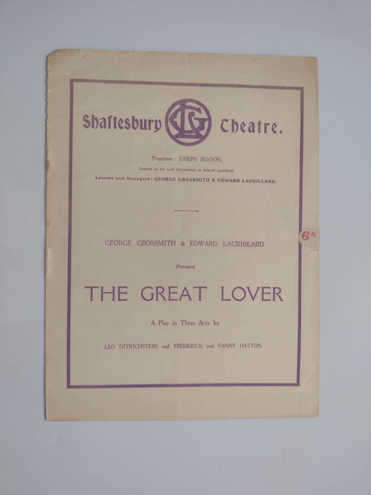 Seller note: You are purchasing vintage & original programme of-: THE GREAT LOVER - Maurice Moscovitch Morton Selten Beverly Sitgreaves Alice Phillips This lovely programme from 1926 Shaftsbury Theatre has rusty staple edge torn otherwise is in very good condition for its age. Please see the picture as it forms part of the description.