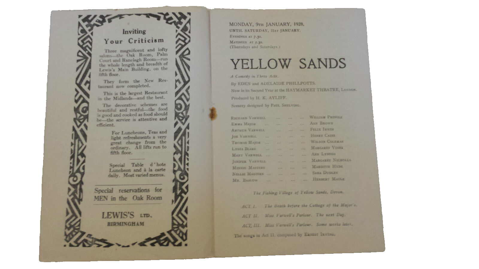1928 Theatre Programme Yellow Sands – William Pringle Ann Brown Felix Irwin