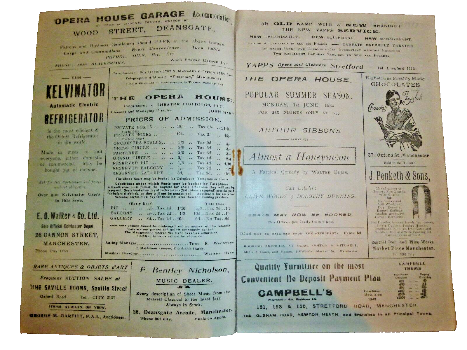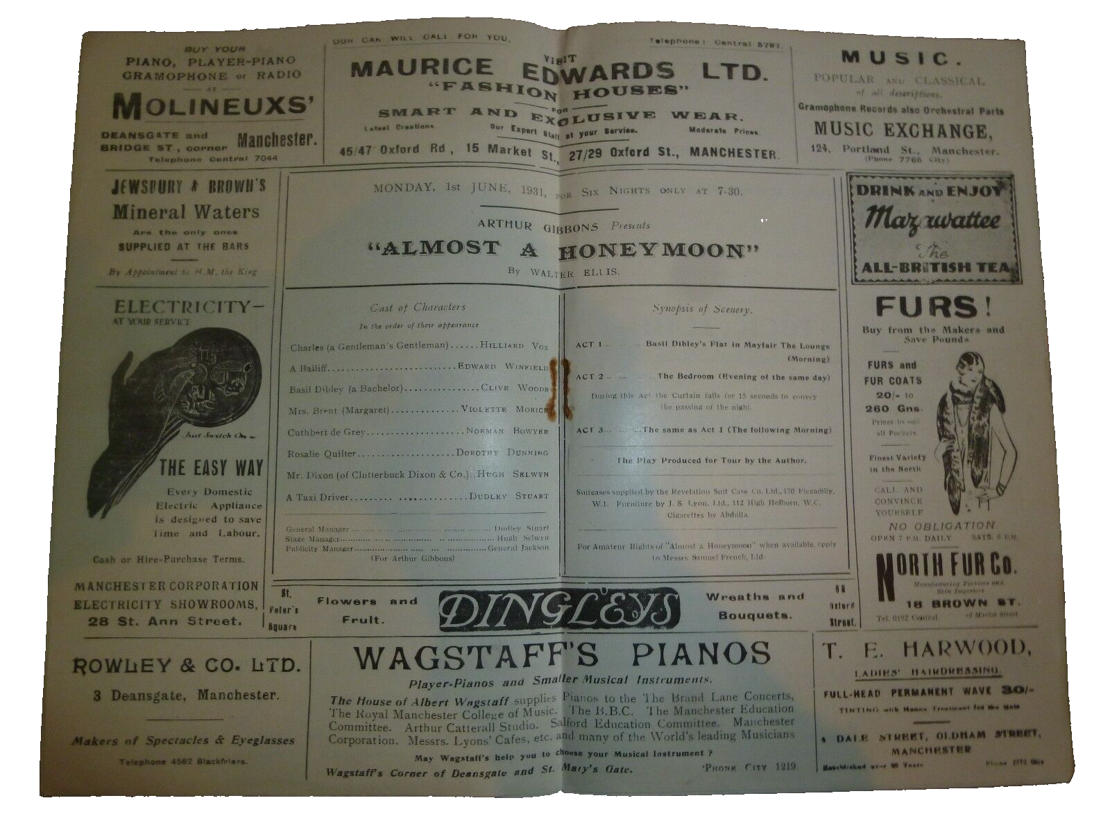 You are purchasing vintage & Original programme. 1931 The Opera House Manchester ALMOST A HONEYMOON – Clive Woods Dorothy Dunning.