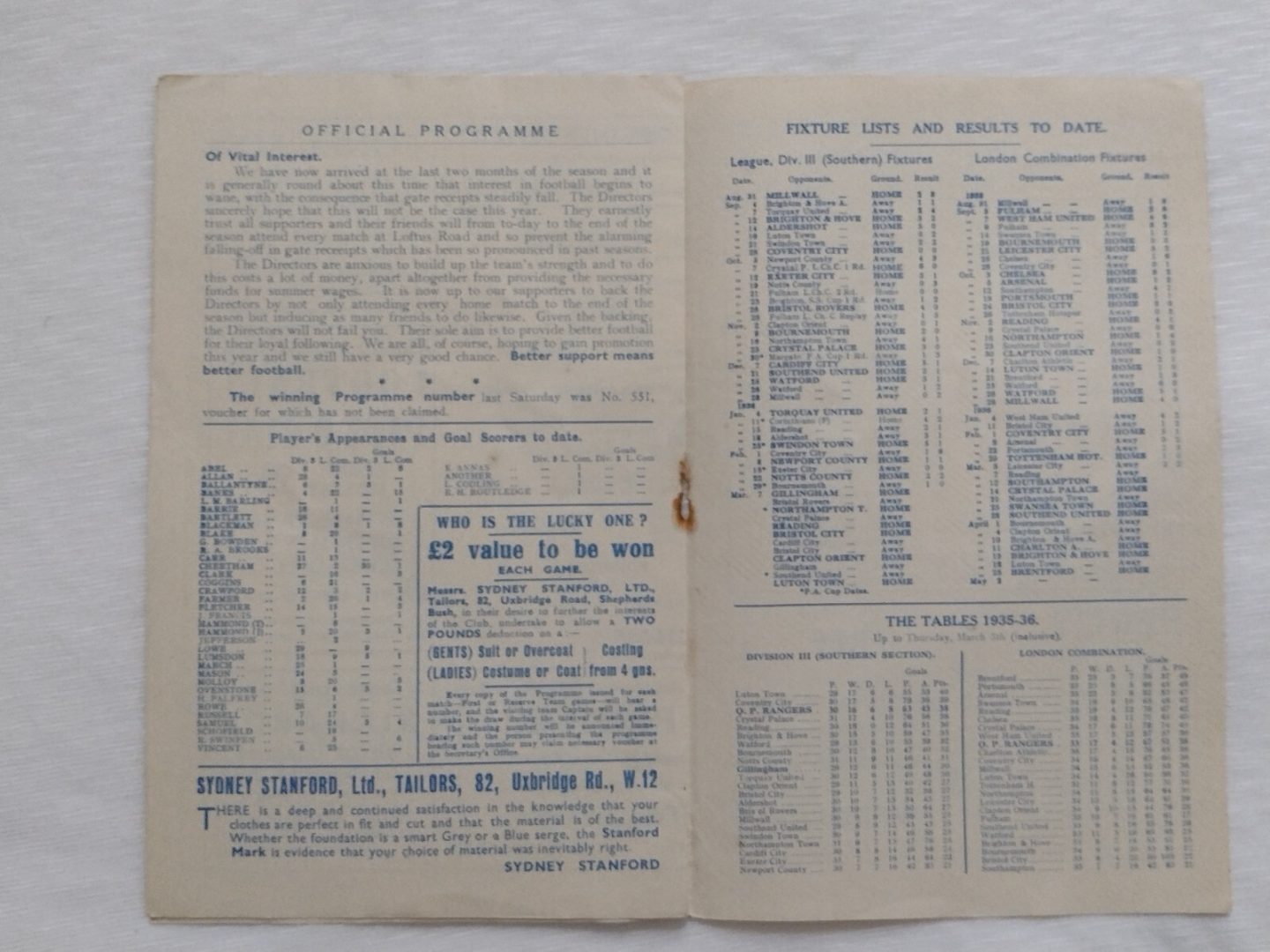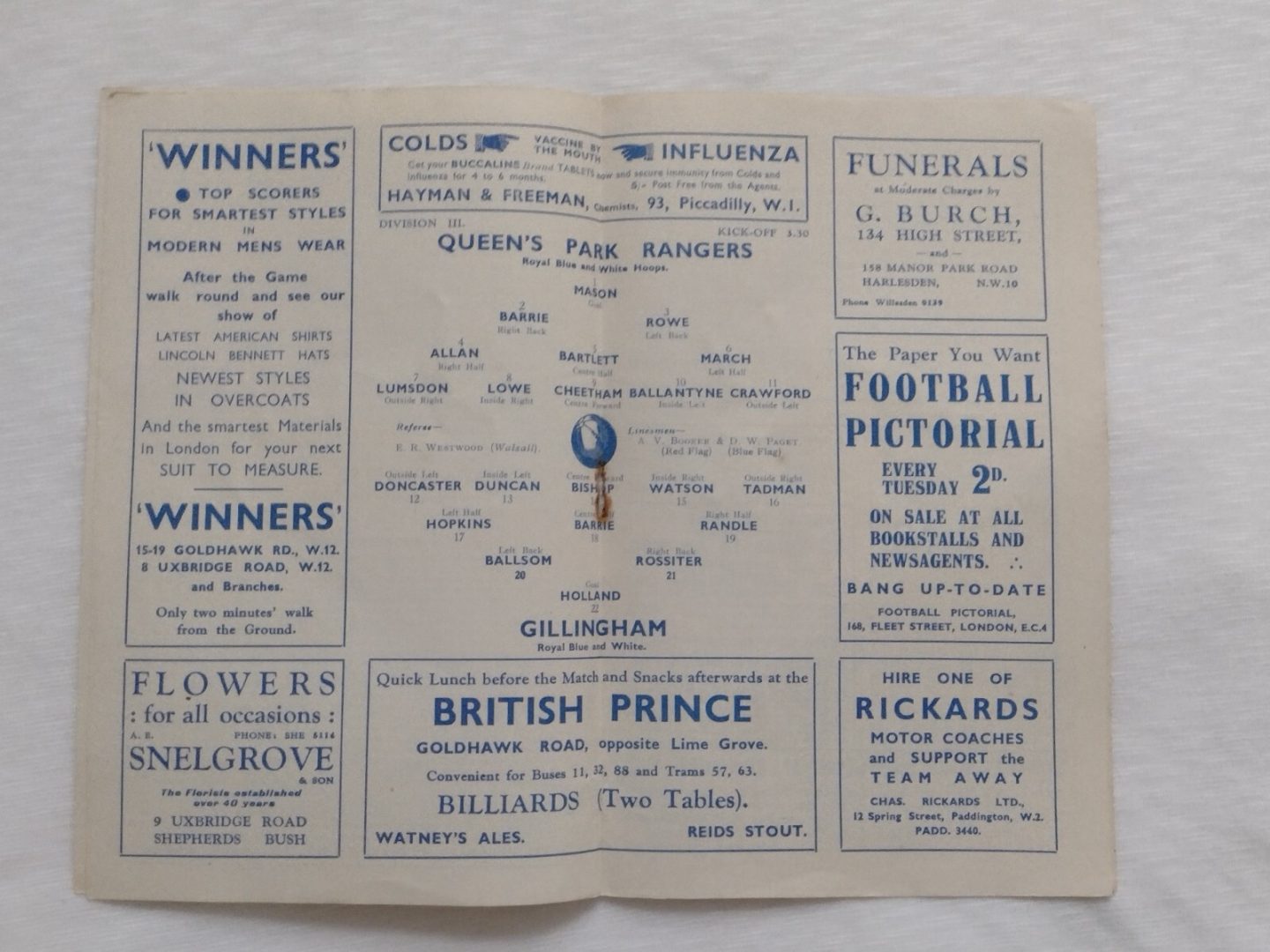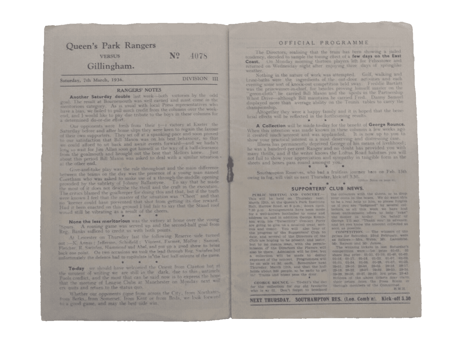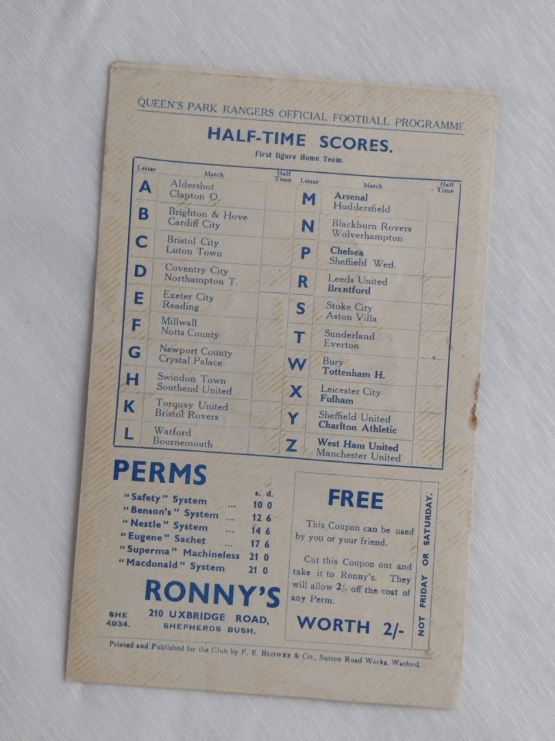 1936 Queens Park Rangers v Gillingham 7th March Div III Very Rare