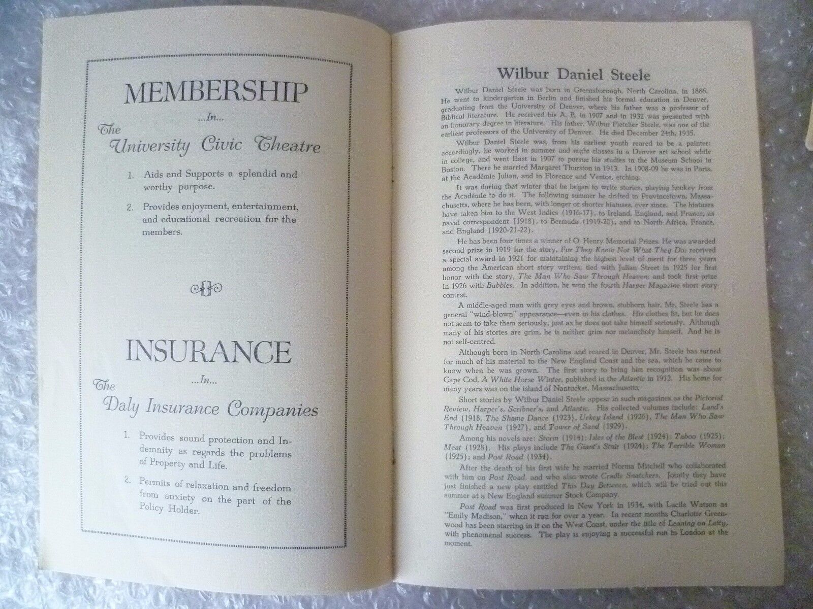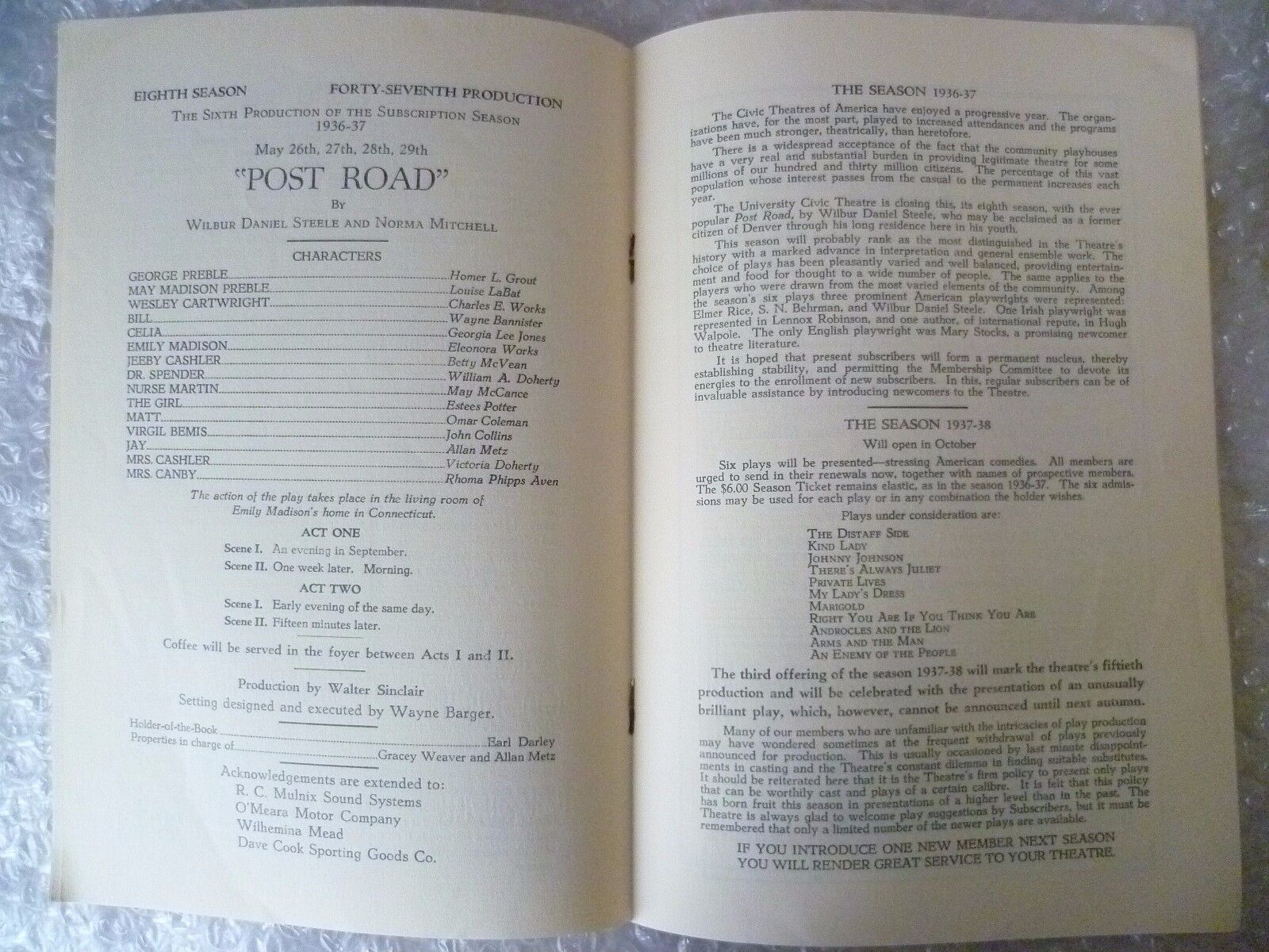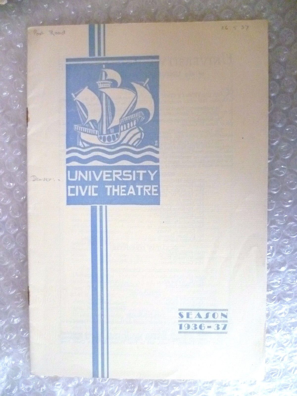 1937 University Civic Theatre Programme POST ROAD-Wilbur Daniel Steele, N Mitche
