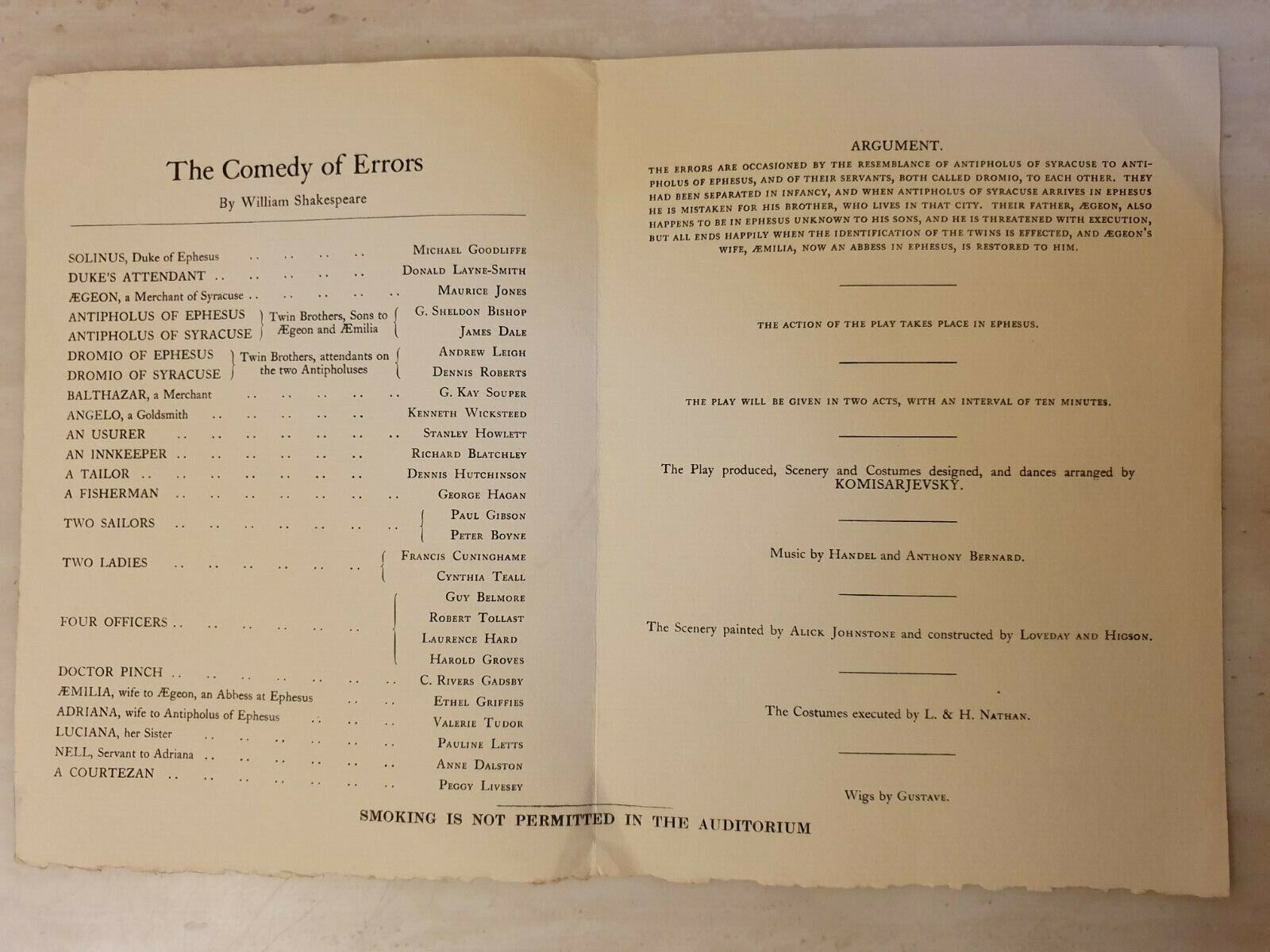 "This lovely rare original theatre programme from 1938 SHAKESPEARE MEMORIAL THEATRE: THE COMEDY OF ERRORS - during SHAKESPEARE FESTIVAL of 1938 from 11th April to 24th September 1938 remains in Very Good condition for its age. "Please see the picture as it forms part of the description.""