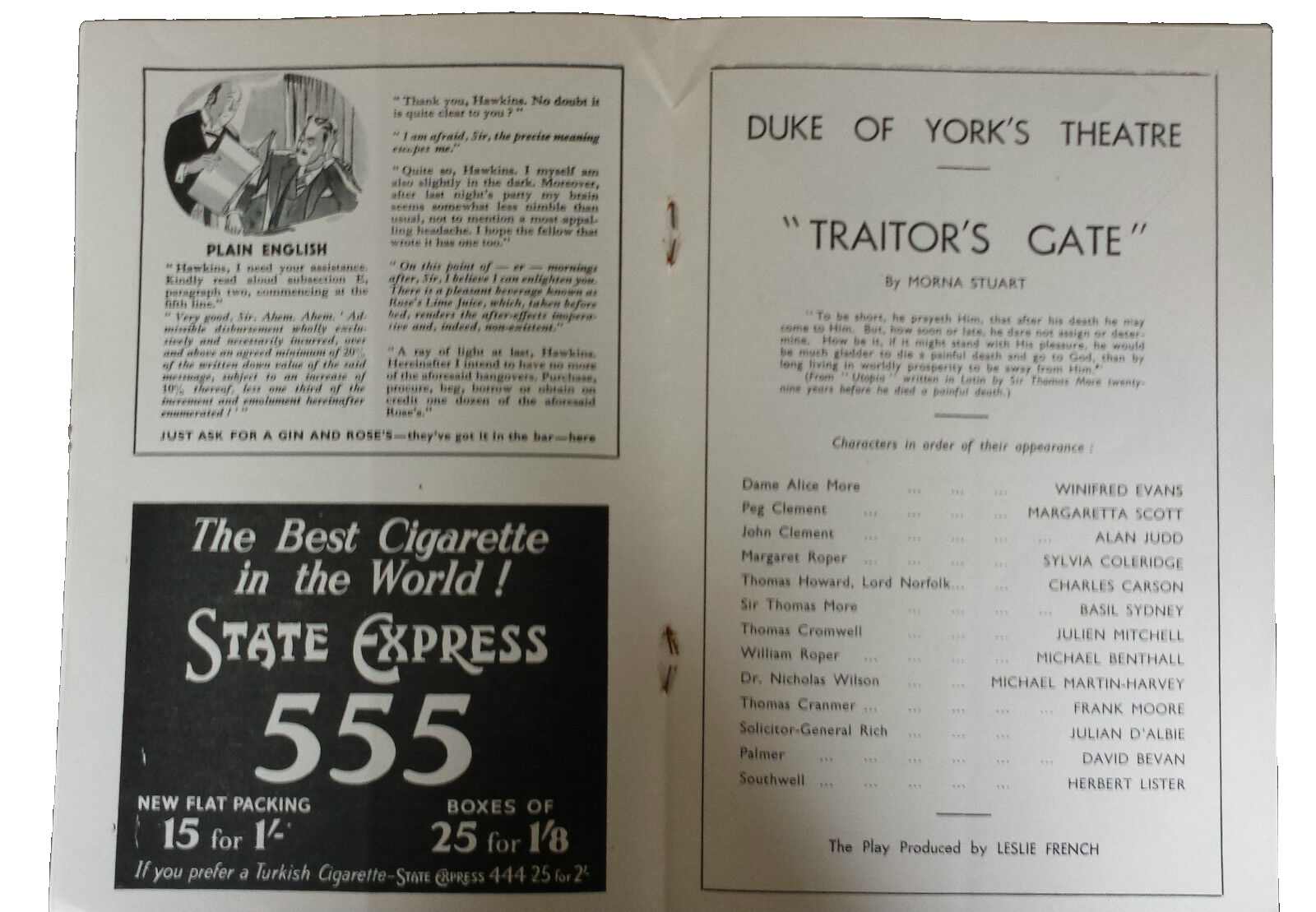 You are purchasing a vintage theatre programme from –1938 Duke of York’s Theatre: “TRAITOR’S AT THE GATE” – by Morna Stuart