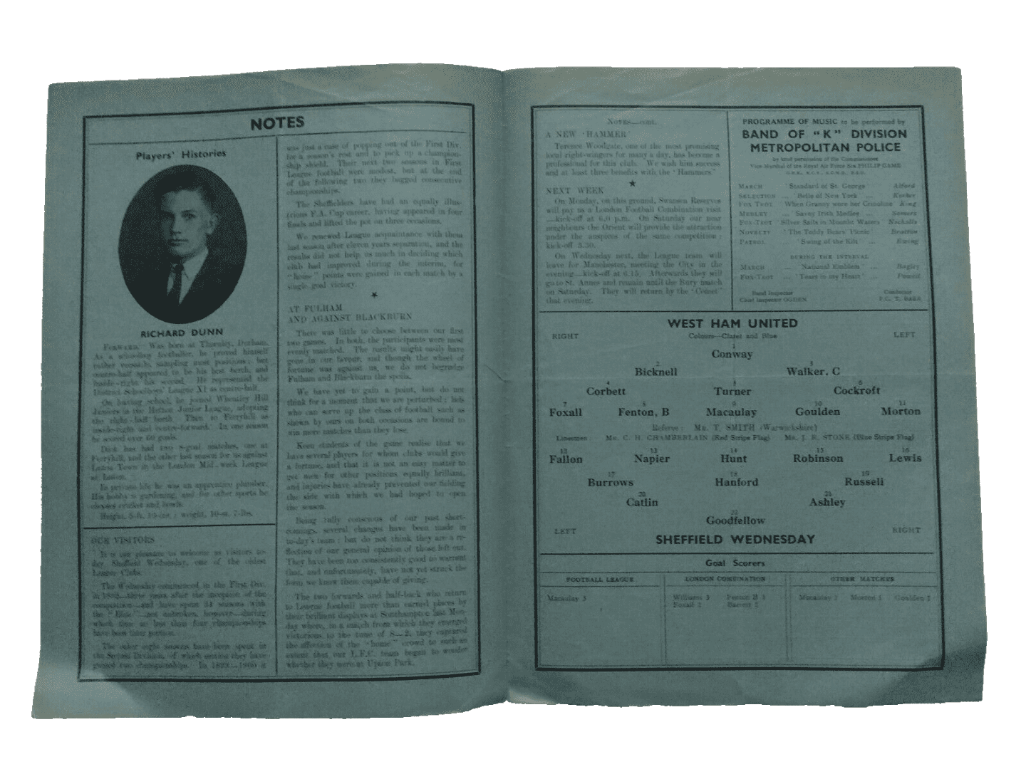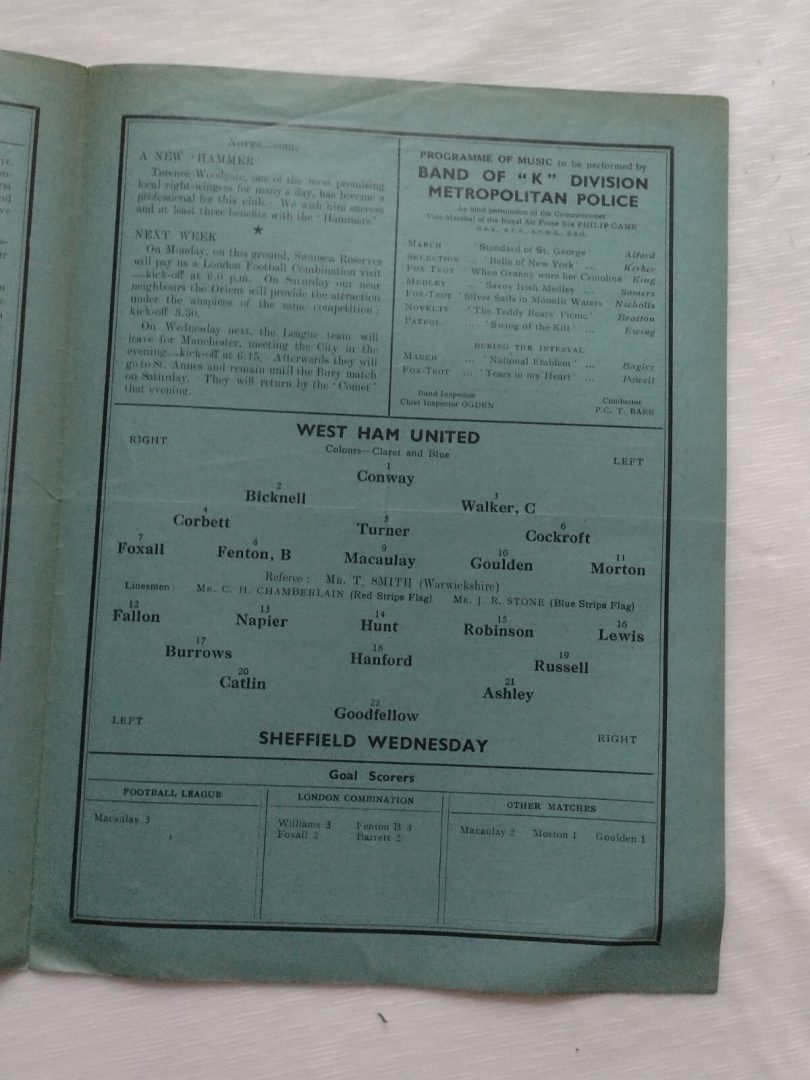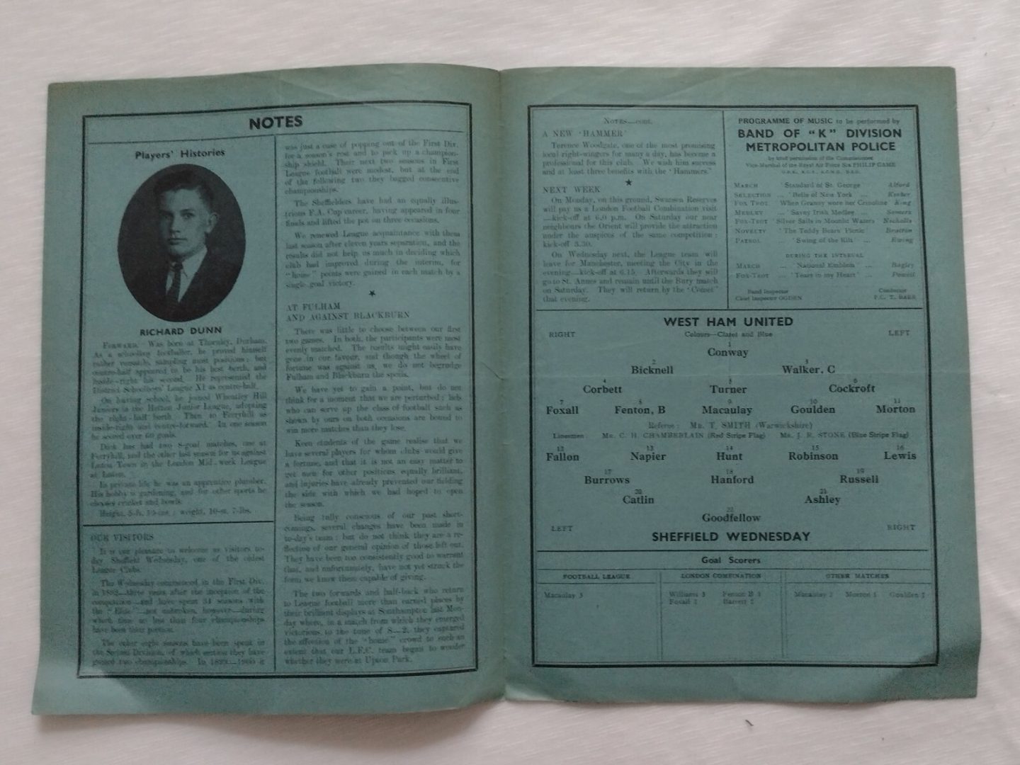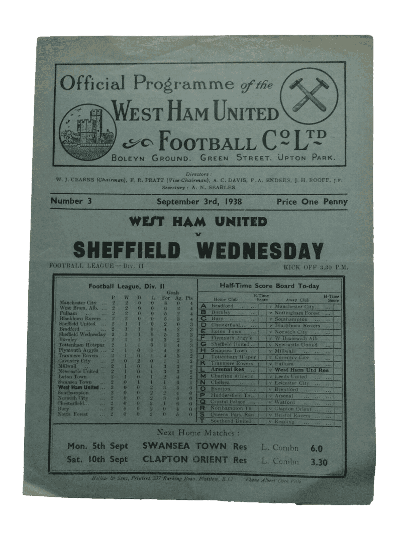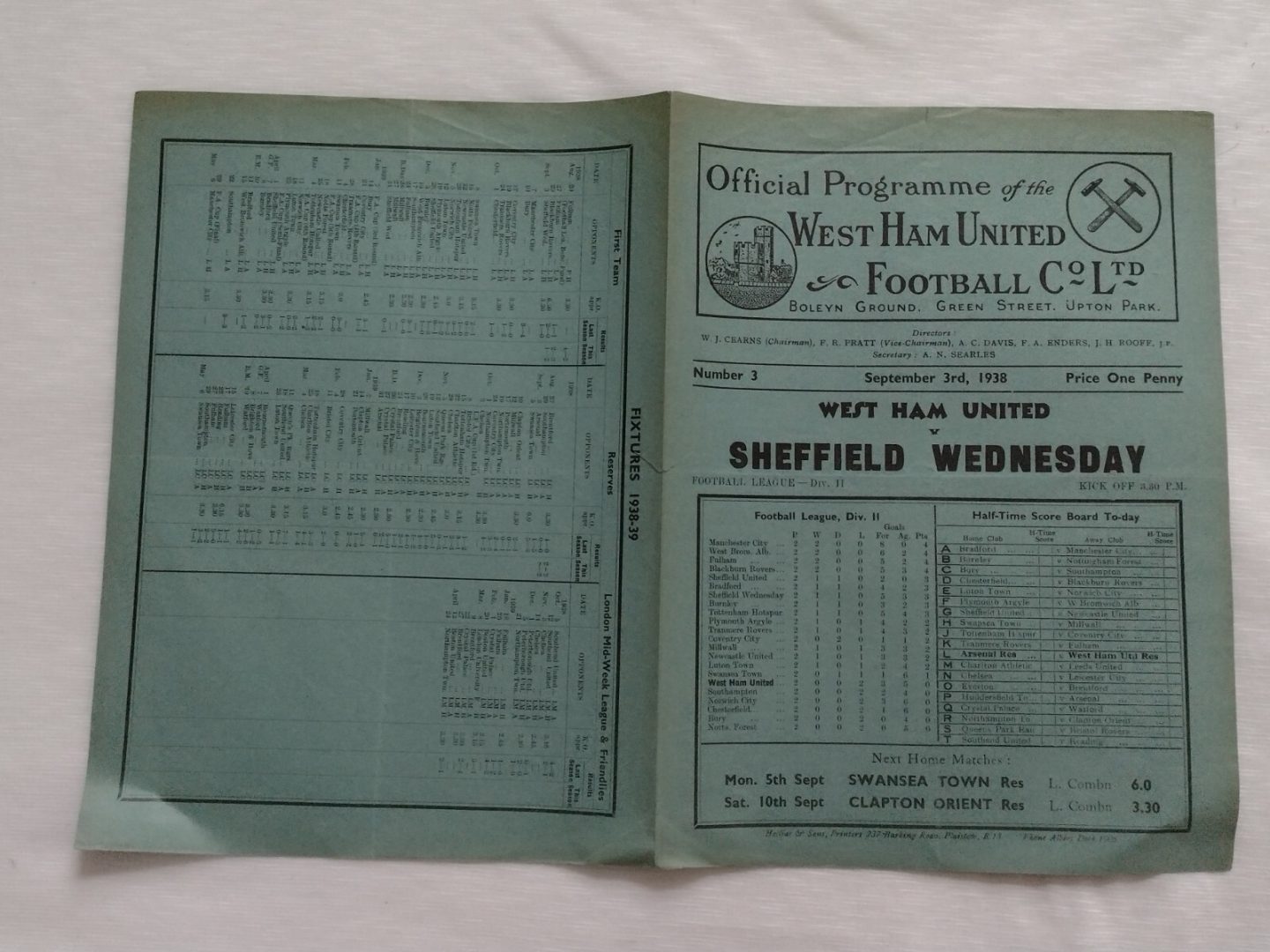 1938 West Ham United v Sheffield Wednesday 3rd Sept League Div II – Very Rare