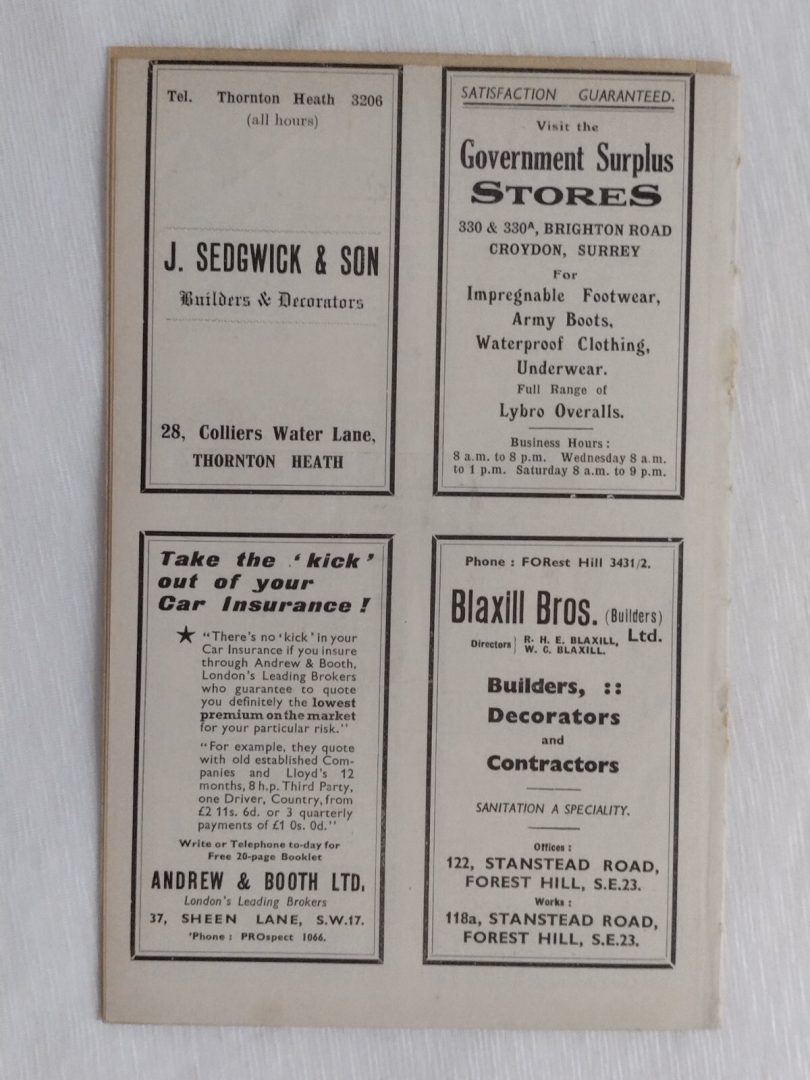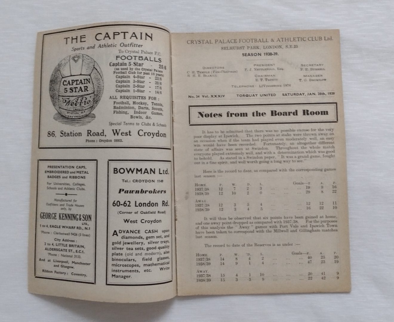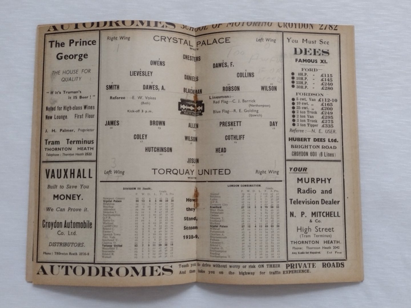 1939 Crystal Palace v Torquay United 28th January Very Rare Programme
