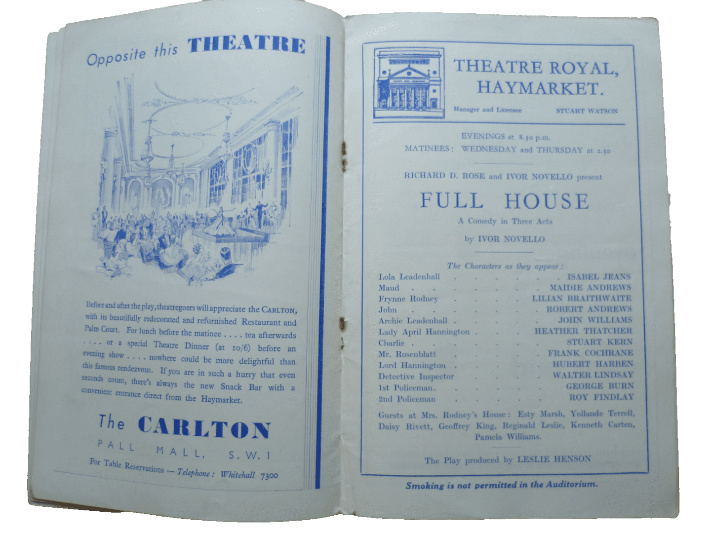 You are purchasing about 100 years old an original vintage very collectable Theatre programme: Theatre Royal, Haymarket Programme 1940 Full House By Ivor Novello
