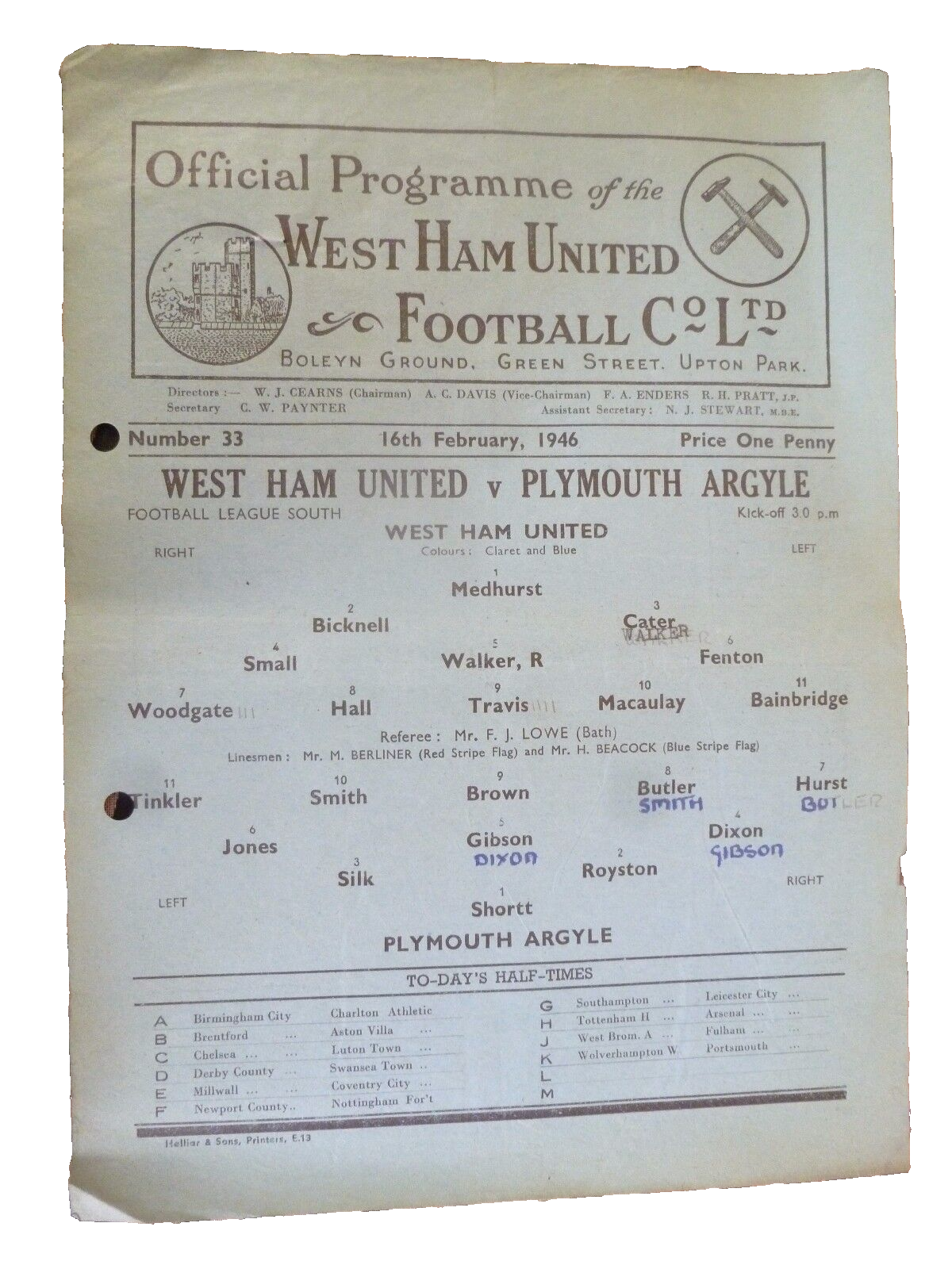 1946 West Ham United v Plymouth Argyle – 16th February