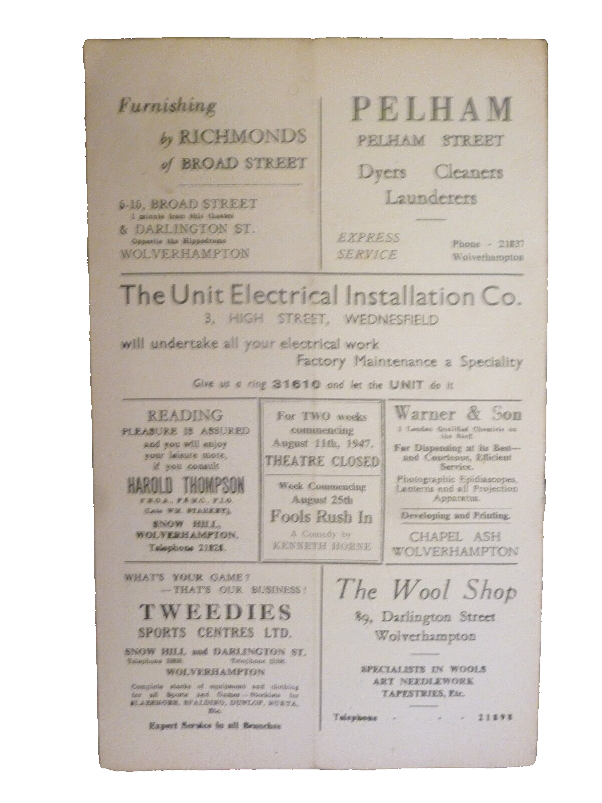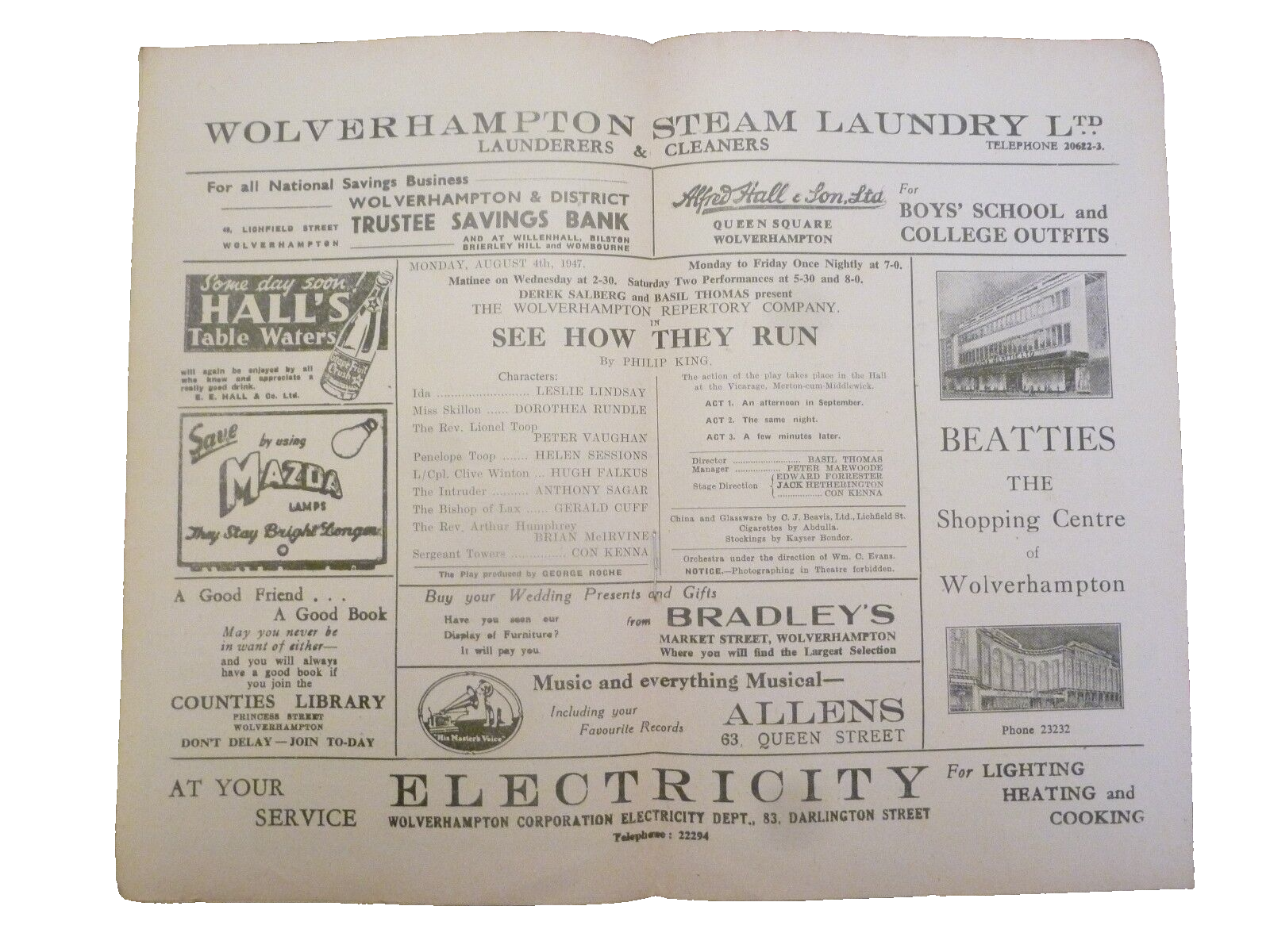 You are purchasing very collectable & original antique theatre programme. 1947 Wolverhampton Grand Theatre – See How They Run – Leslie Lindsay Peter Vaugh