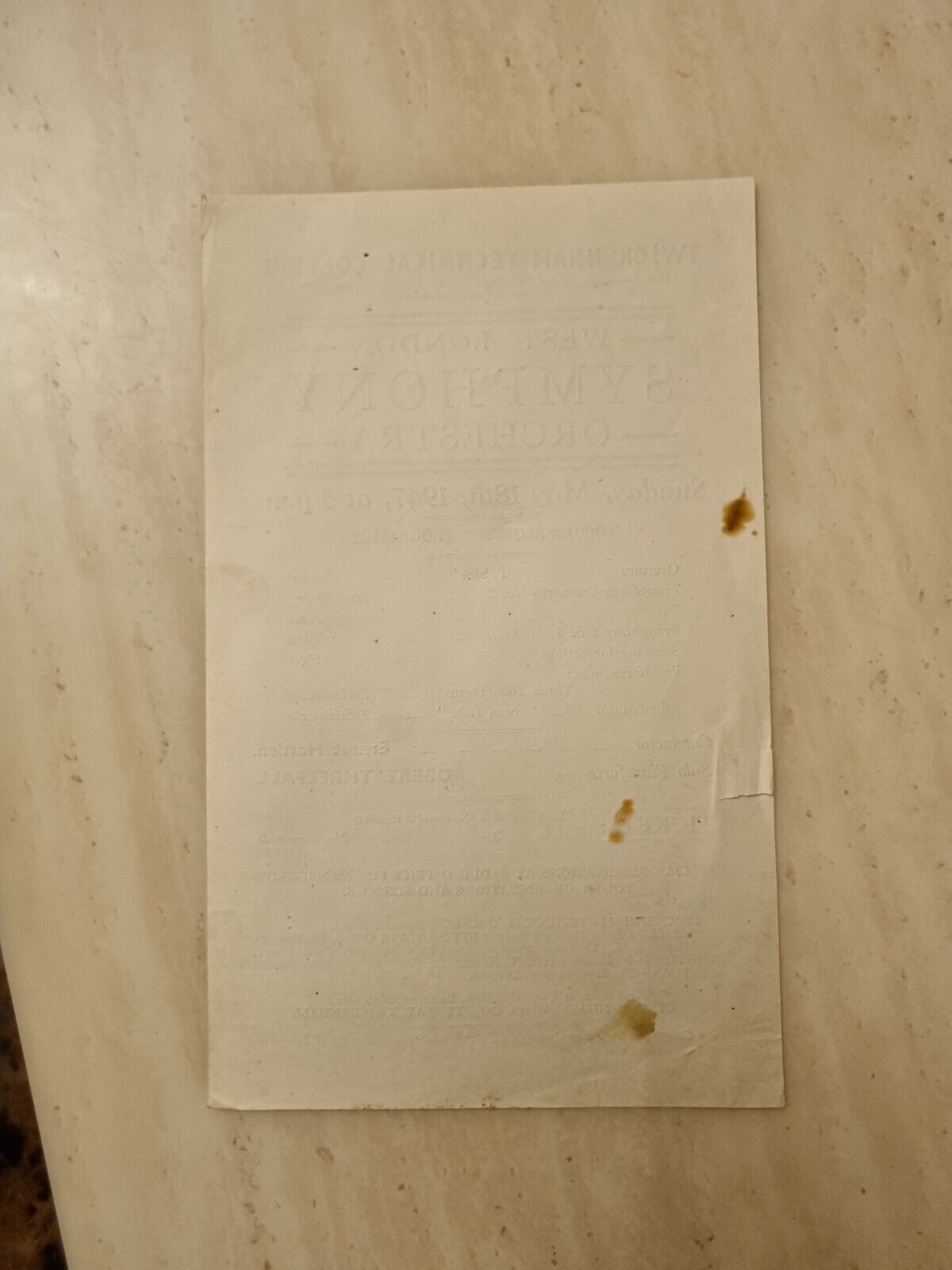 "This is a single sheet Original programme from 1947 Twickenham Technical College West London Symphony Orchestra - conductor Ernest Harden and Solo Pianoforte Robert Threlfall , The Programme remains is in good condition for its age. Please see the picture as it forms part of the description."