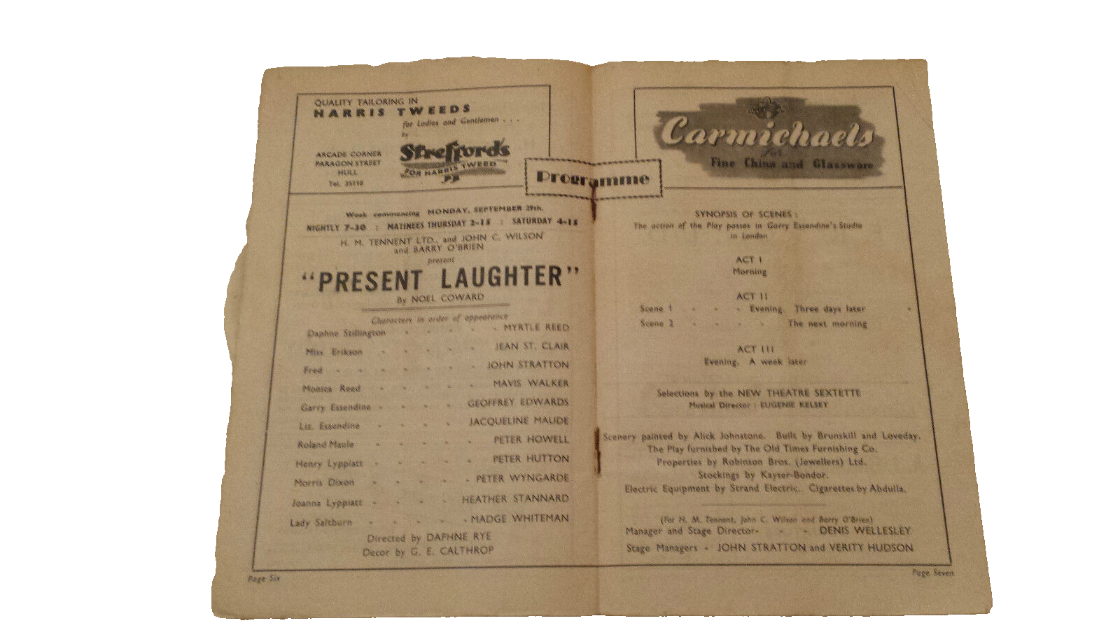 You are purchasing an original vintage theatre programme of: 1950’s New Theatre Hull: Myrtle Reed Jean ST Clair in PRESENT LAUGHTER by Noel Coward.