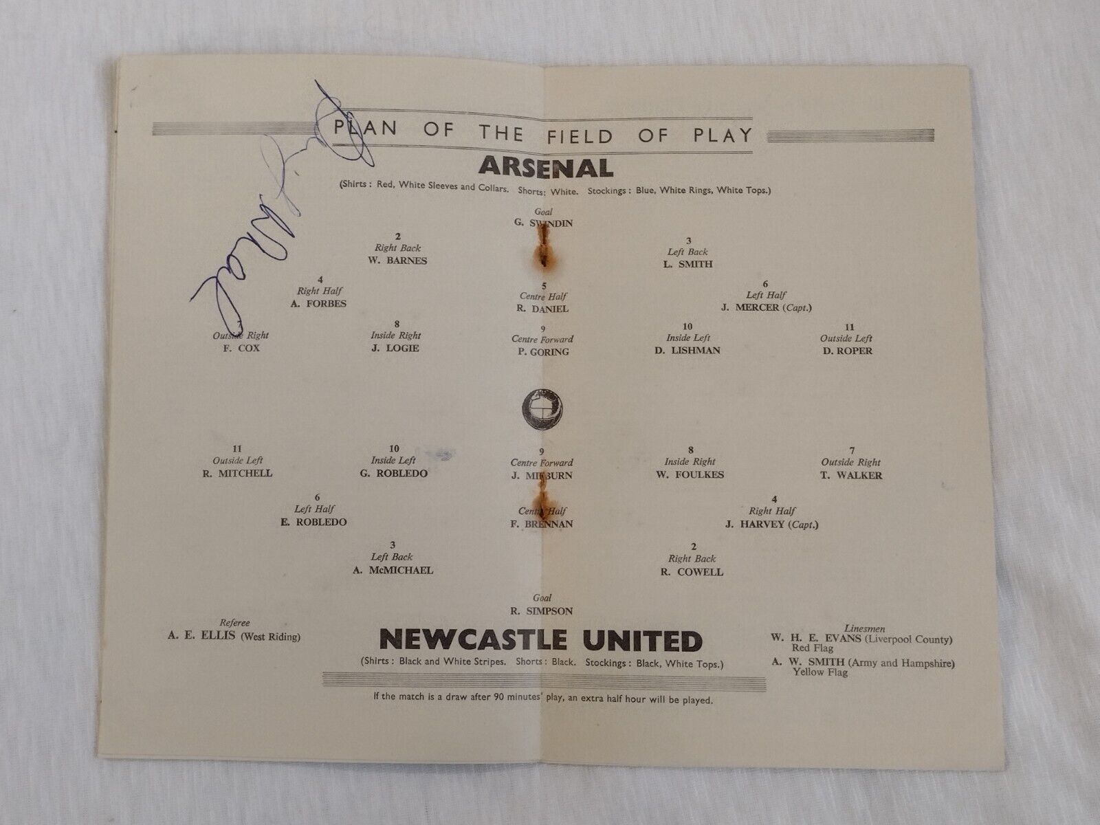 "The lovely Original football programme has rusty staple Staple pin removed otherwise is in very good condition for its age. Please see pictures as it provides part of the description."