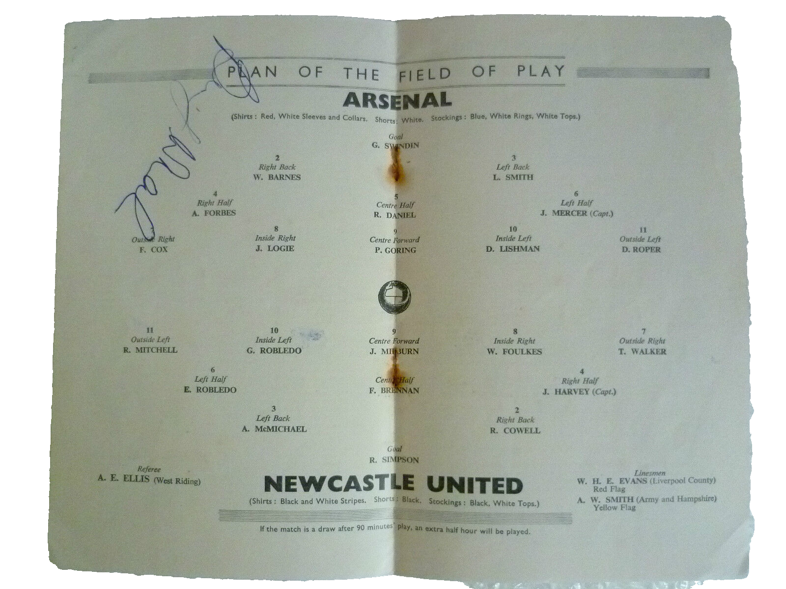 1952 FA Cup Final Arsenal v Newcastle United 3rd May – Billy Wright Hand Signed