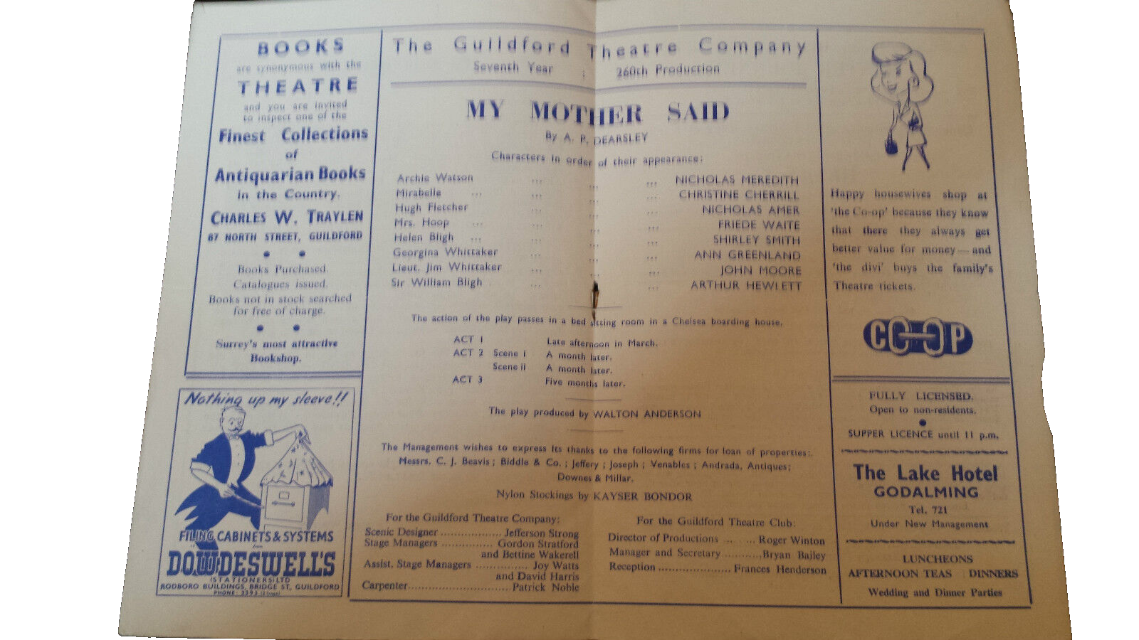 You are purchasing a vintage theatre programme from:1953 Guildford Theatre: Nicholas Meredith Christine Cherrill in MY MOTHER SAID.