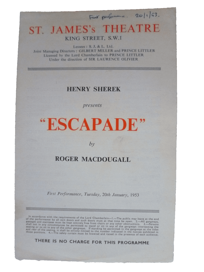 1953 St. James Theatre Programme Escapade – Dorothy Turner Hugh Griffith D March