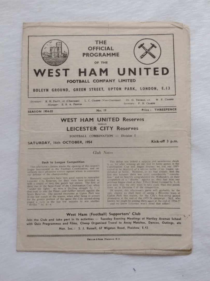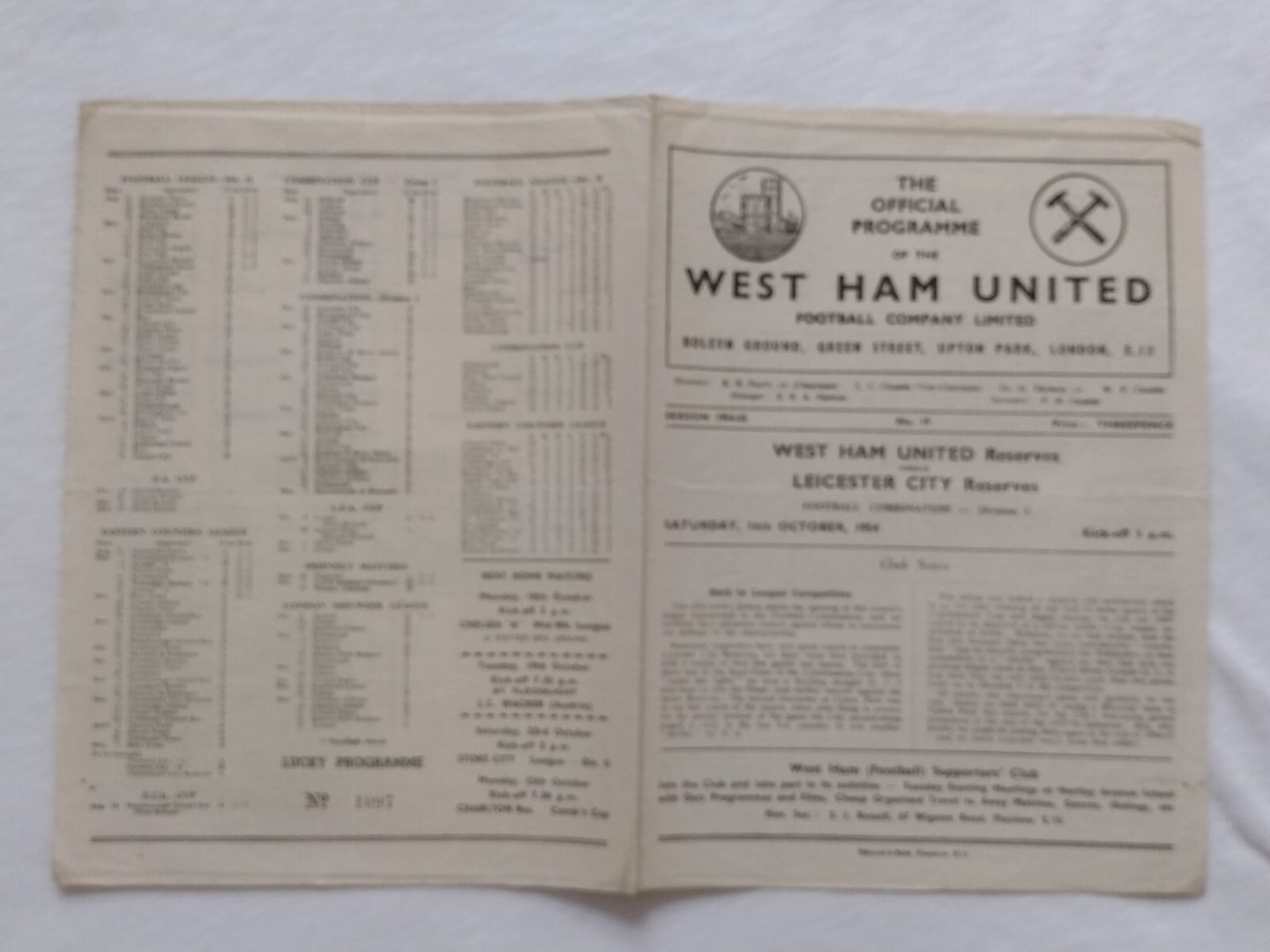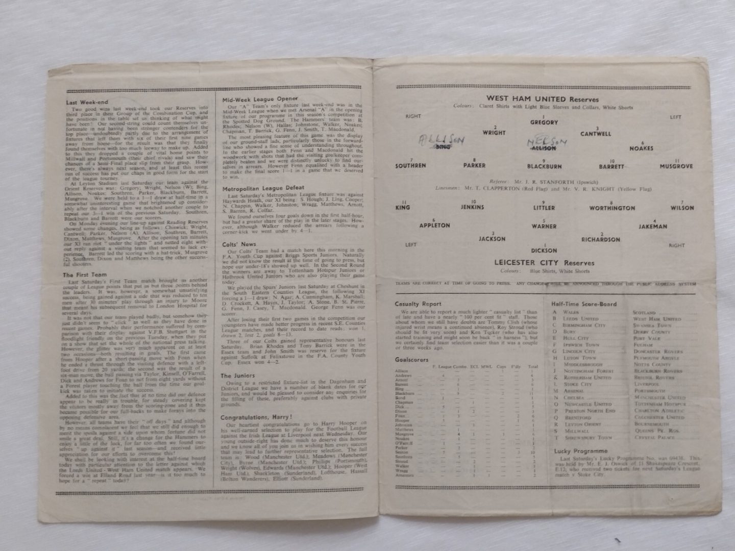 1954 West Ham United Reserves v Leicester City Reserves 16th Oct Division One