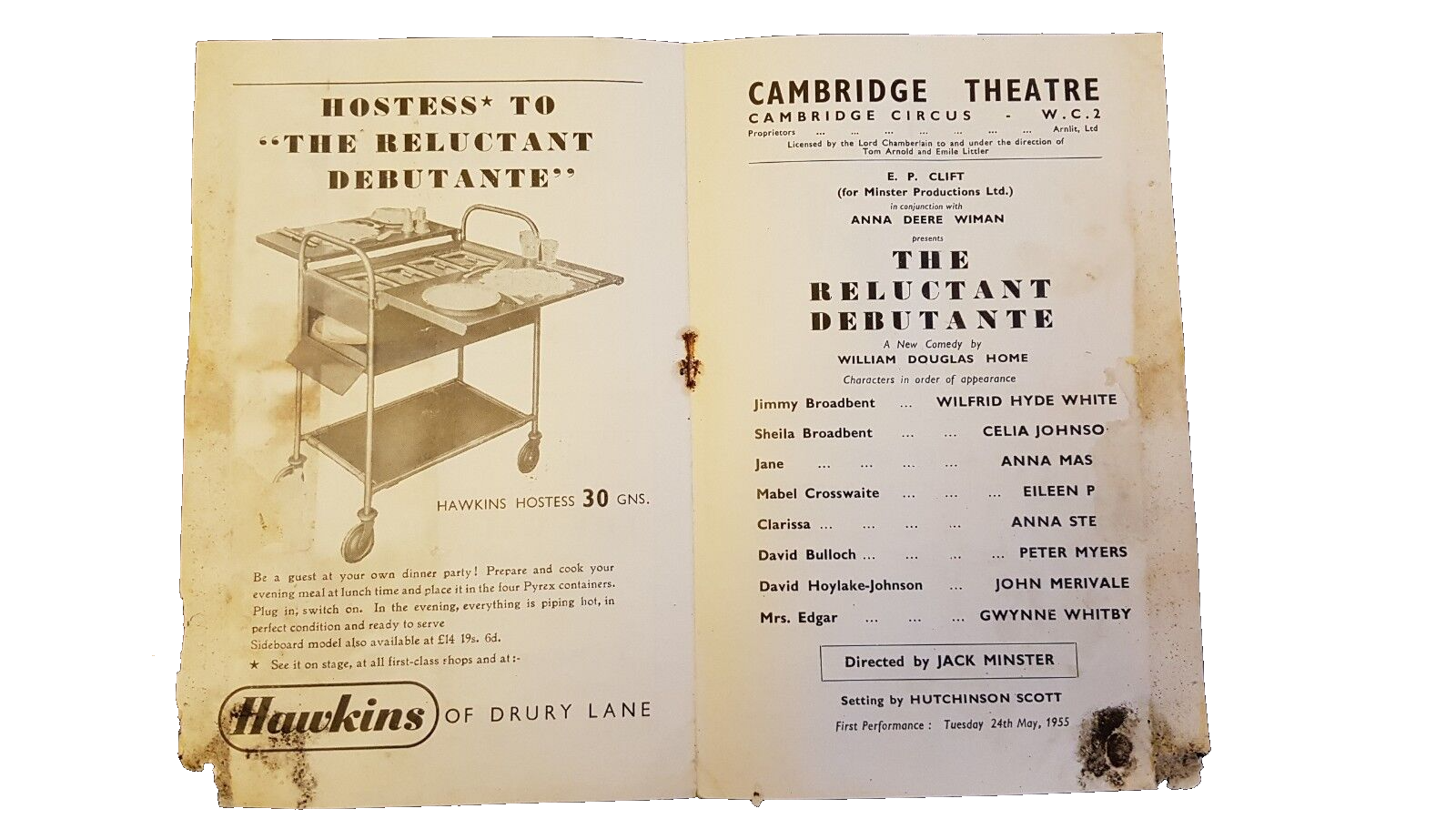You are purchasing a vintage theatre programme from: 1955 Cambridge Theatre: Wilfrid Hyde White Celia Johnson Anna Massey in THE RELUCTANT DEBUTANTE . The programme comes with press cuttings.