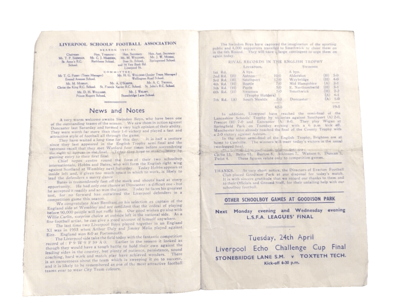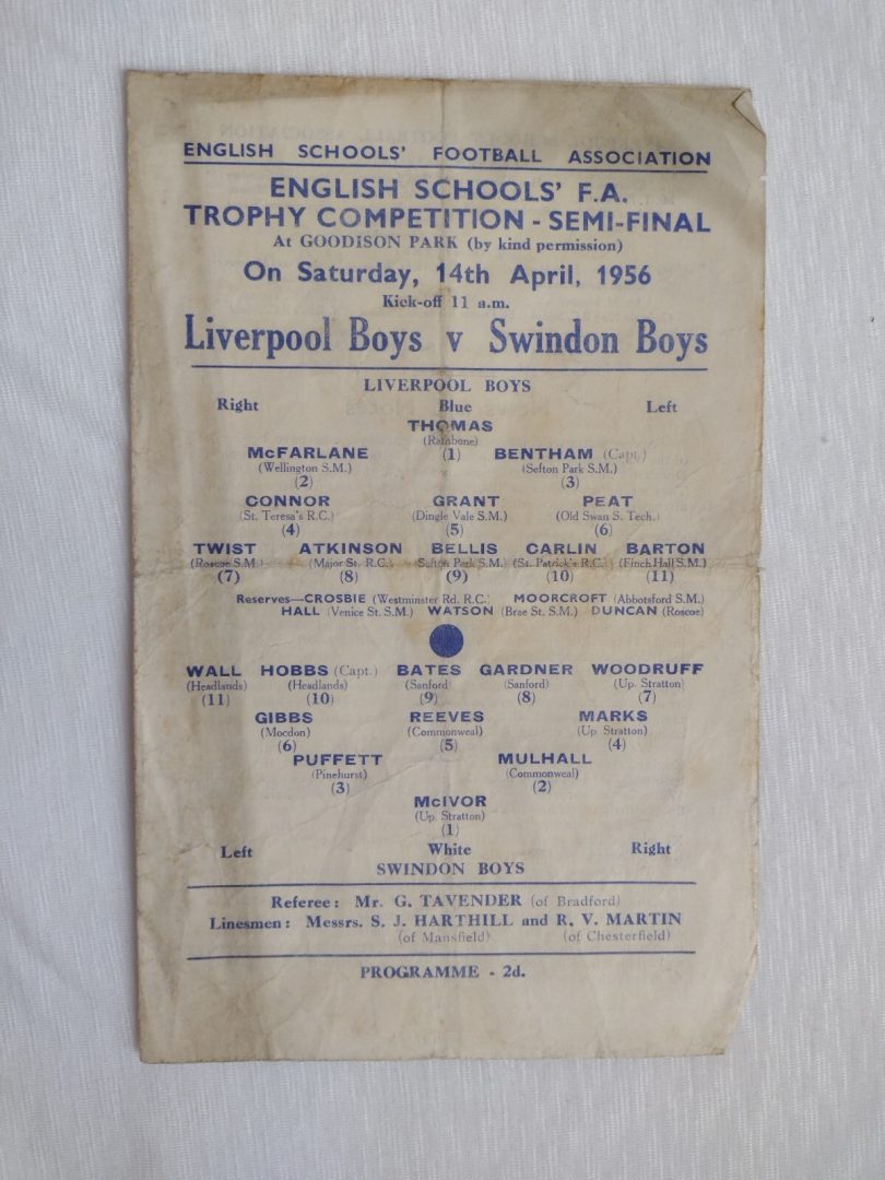 1956 Liverpool Boys v Swindon Boys 14th April English School Boy Semi Final Rare