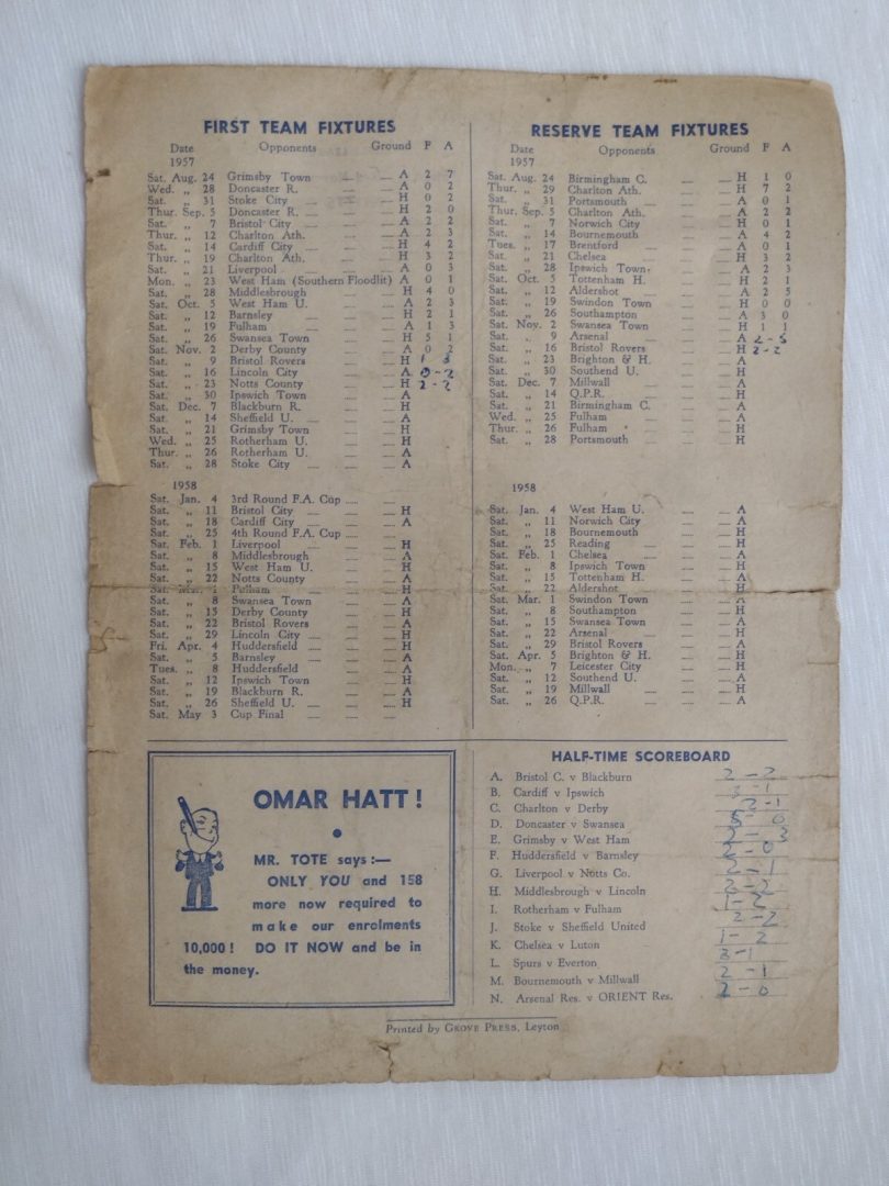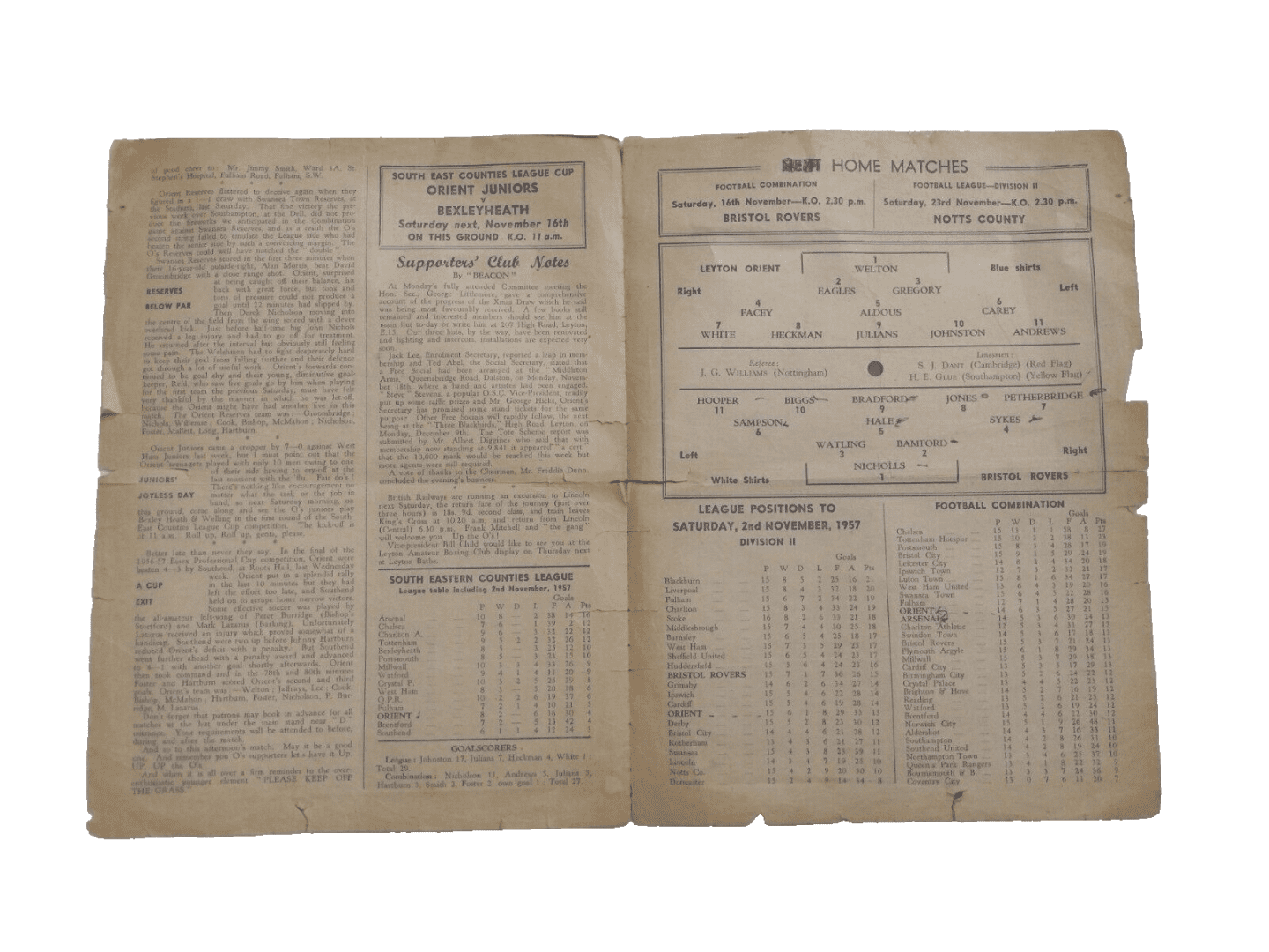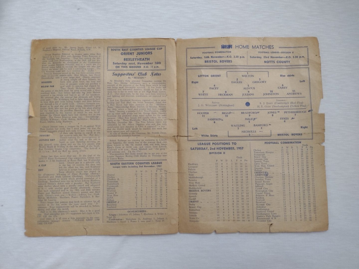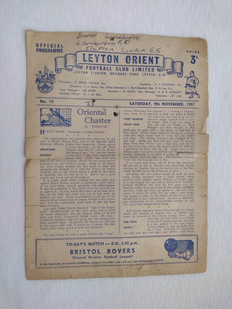 1957 Leyton Orient v Bristol Rovers 9th November 2nd Division Football League