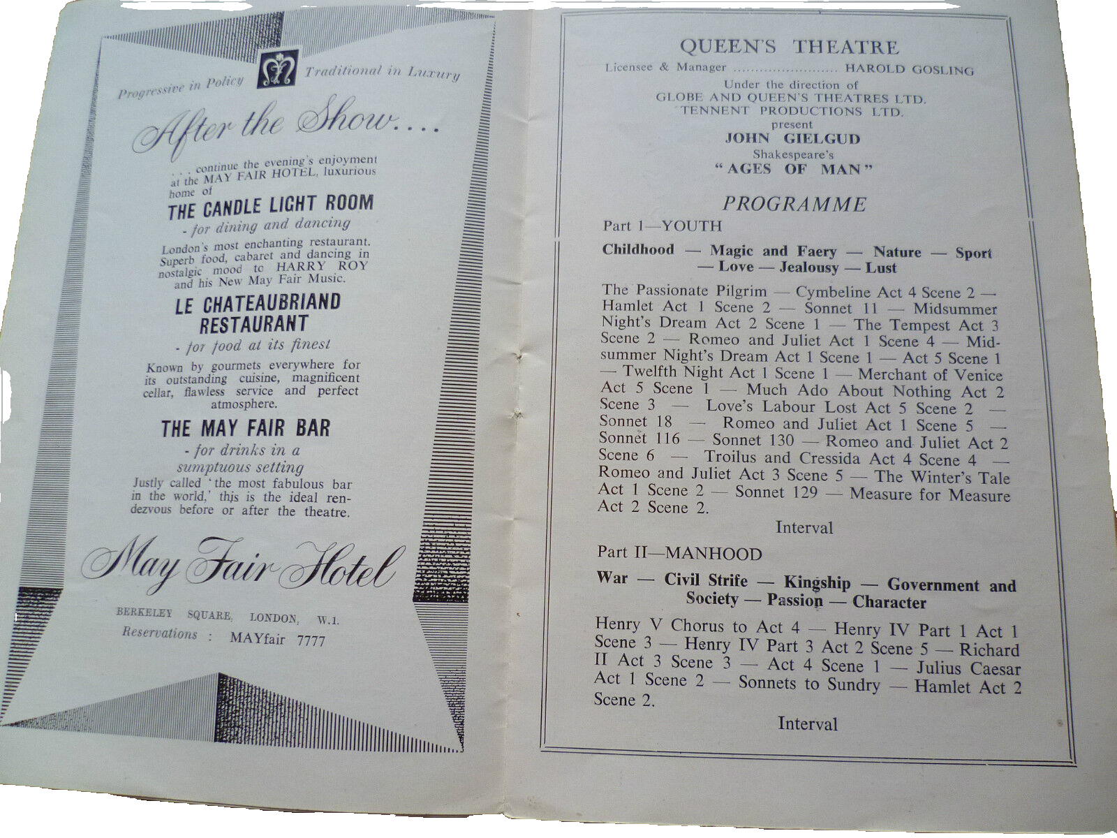 You are purchasing an original vintage very collectable Theatre programme from: QUEEN’S THEATRE PROGRAMME 1958- JOHN GIELGUD by Shakespeare’s AGES OF MAN.