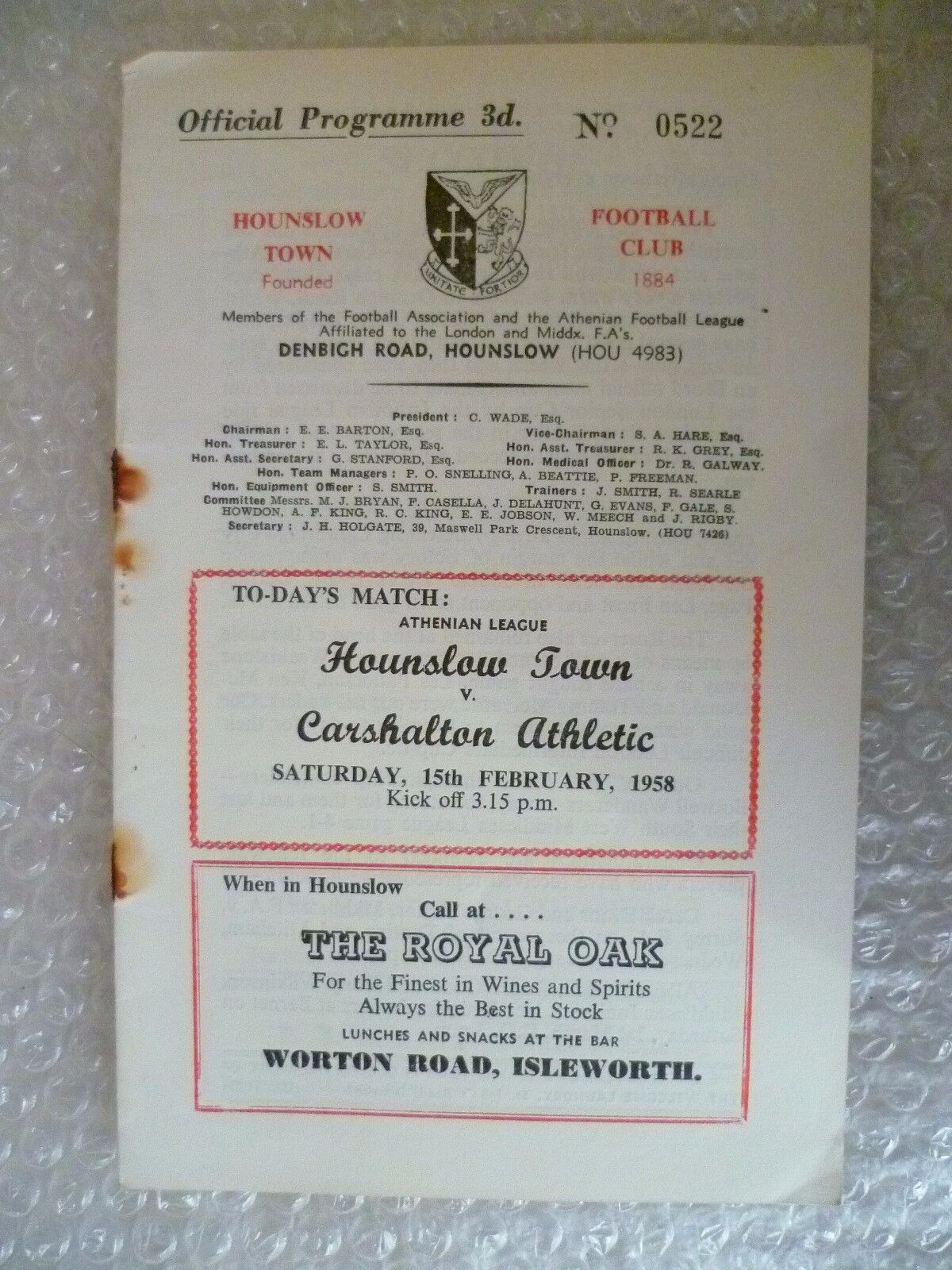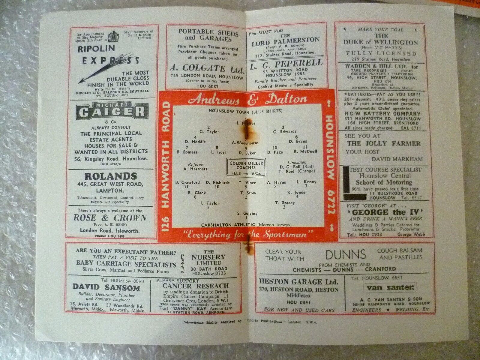 1958 HOUNSLOW TOWN v CARSHALTON ATHLETIC, 15th Feb (Athenian League)