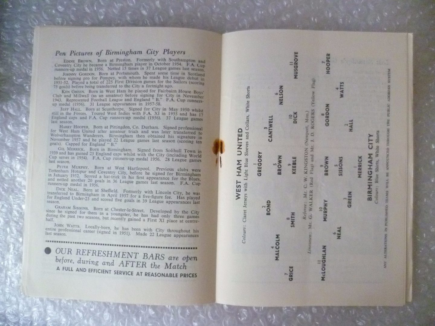 1958 WEST HAM UNITED v BIRMINGHAM CITY, 11th Oct (League Division One)
