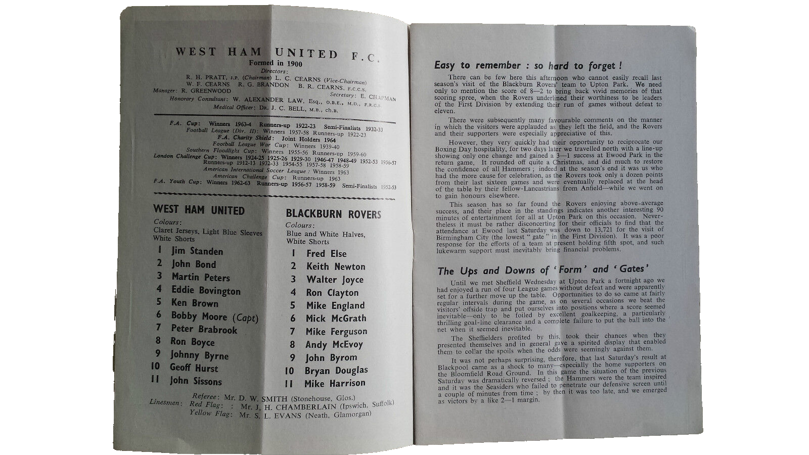 are purchasing the official football programme of: 1964/65 League Division One- WEST HAM UNITED v BLACKBURN ROVERS 7th November