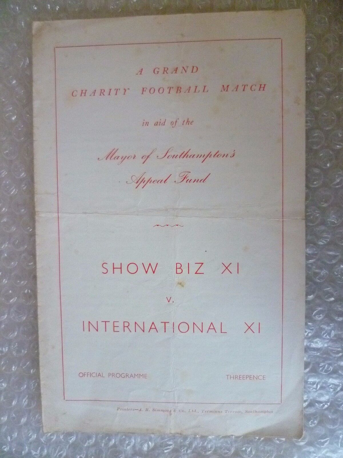"This lovely original 1964 Charity Match Programme was in Aid of the Mayor of Southampton's Appeal Fund. The programme has fold/stain otherwise is in very good condition for its age. "Please see the picture as it forms part of the description"."