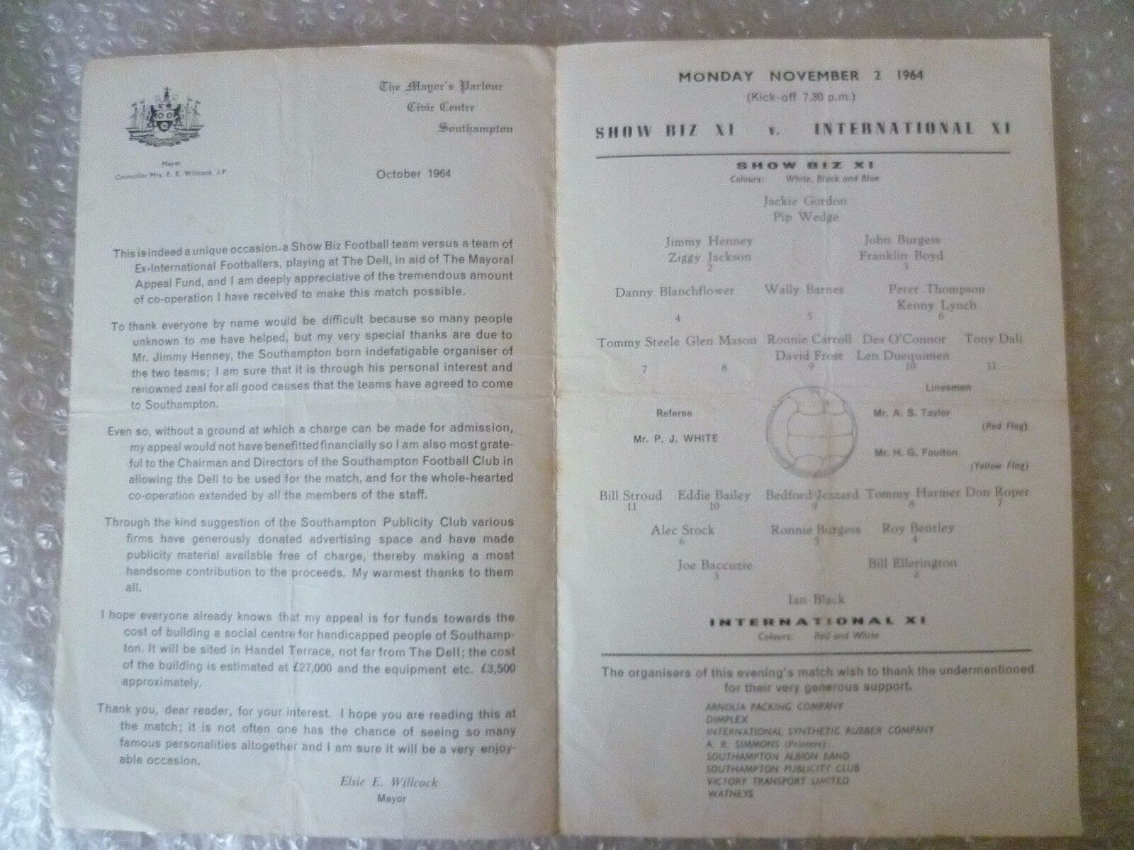 1964 Charity Match Programme SHOW BIZ XI v INTERNATIONAL XI, 2nd Nov