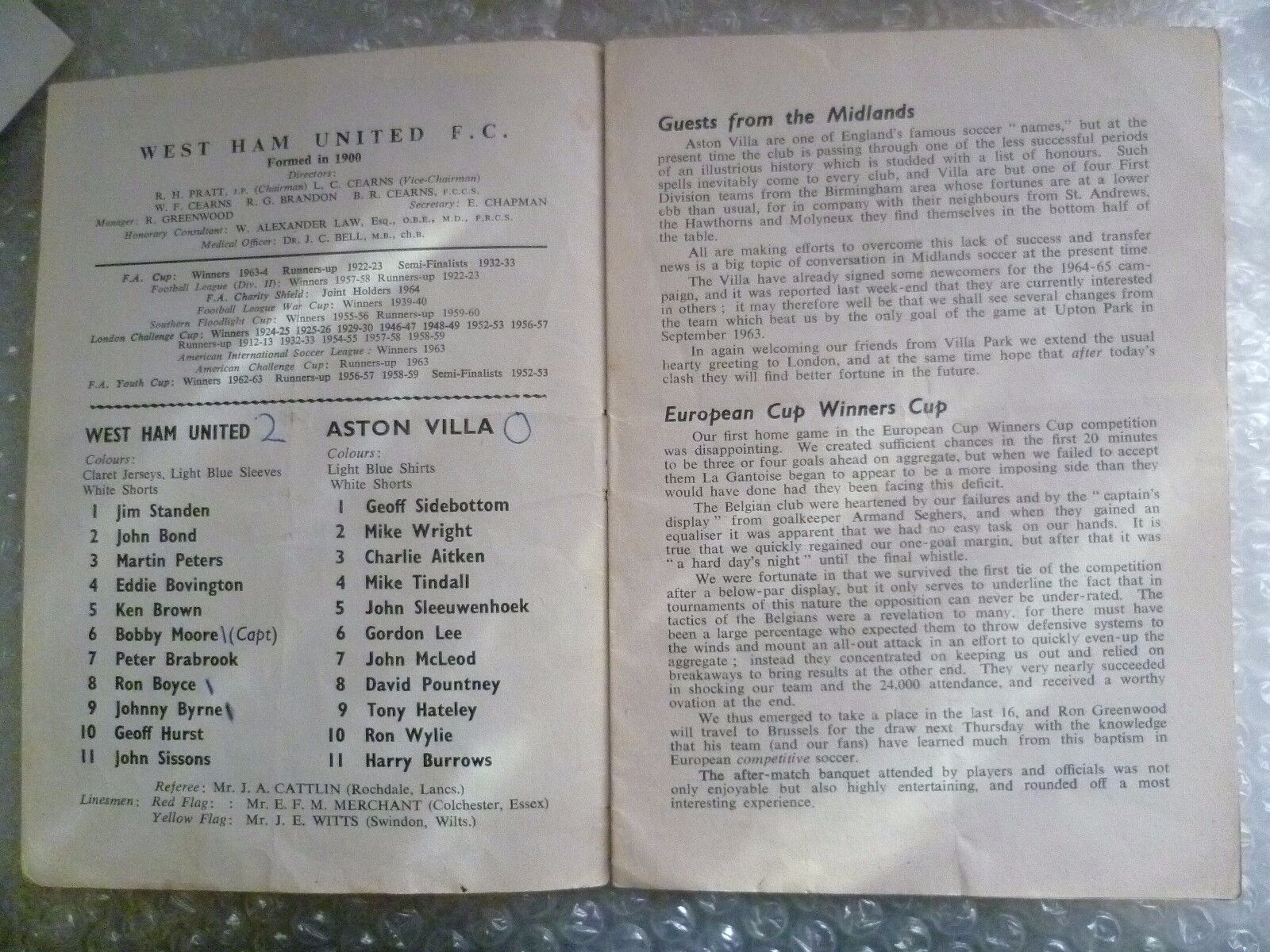 1964 WEST HAM UNITED v ASTON VILLA, 10th Oct (League Division One)