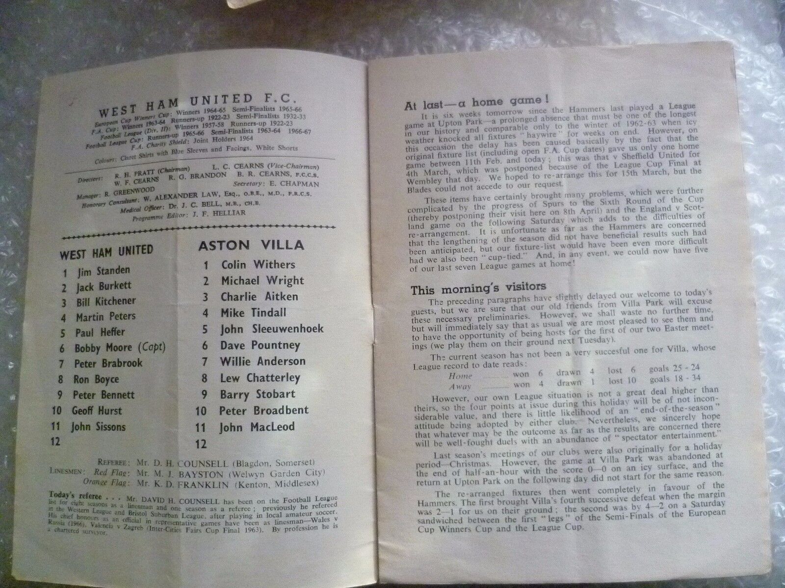 1967 WEST HAM UNITED v ASTON VILLA, 24th March (League Division One)