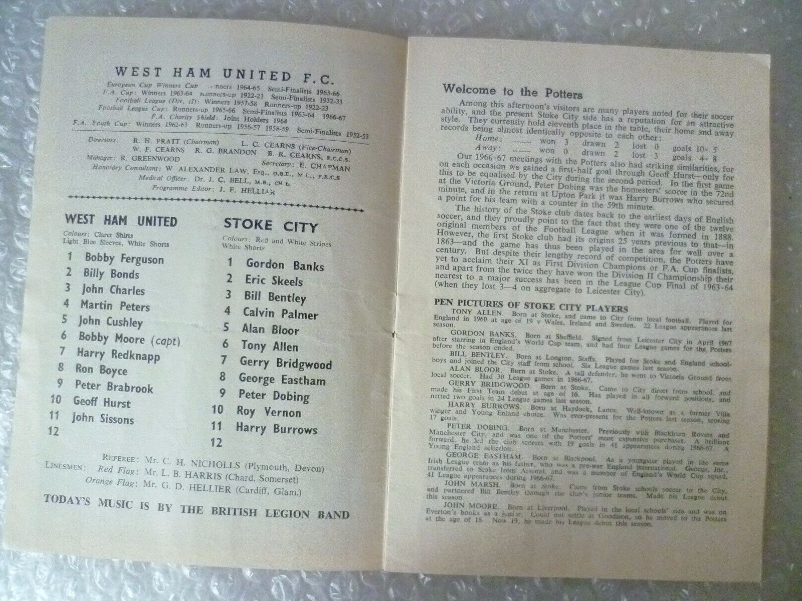 1967 WEST HAM UNITED v STOKE CITY, 7th Oct (League Division One)