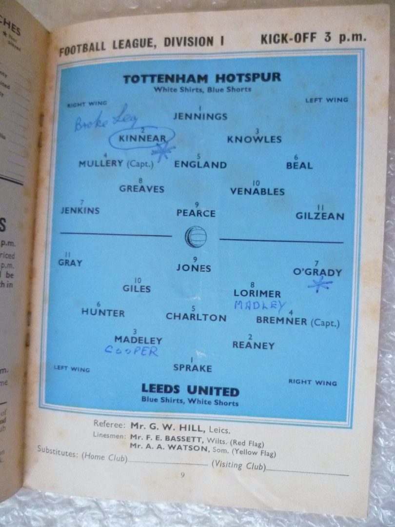 1969 Tottenham Hotspur v Leeds United, 18th Jan (League Division One)