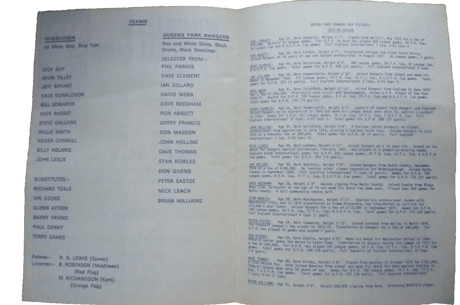 1977 Wimbledon v Queens Park Rangers 10 August Pre Season Friendly Match