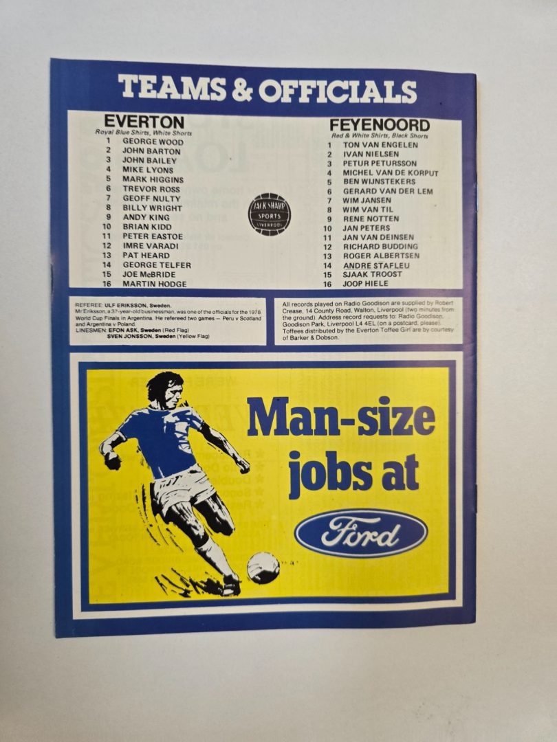 This is the official match day magazine for UEFA Cup first-round, second-leg match between Everton and Feyenoord. The match took place on Wednesday, October 3, 1979. The game was held at Goodison Park, with a recorded attendance of 28,203