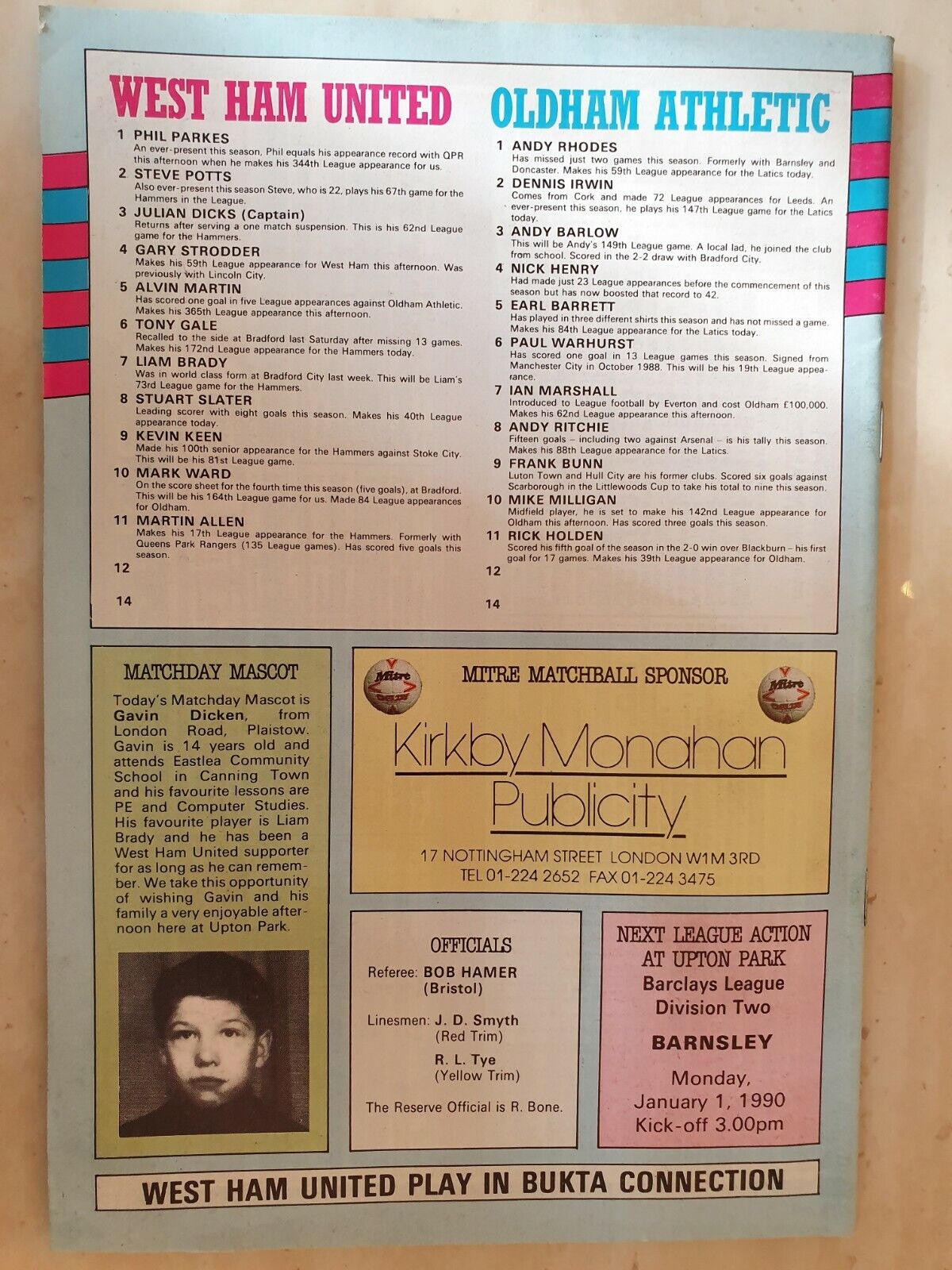 1989 WEST HAM UNITED v OLDHAM ATHLETIC 16th December