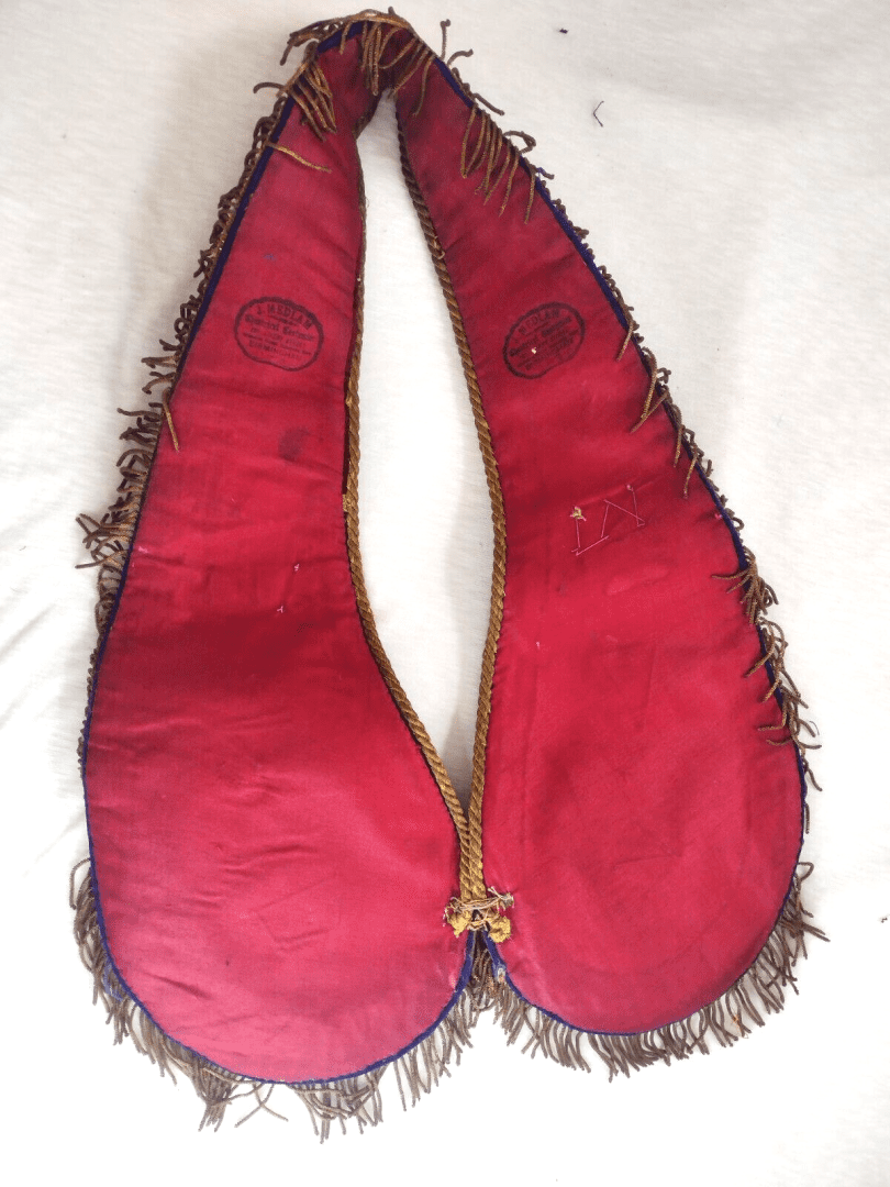 Size approximately Long 54 cm x Length 38 cm. I believe this to be an original item and as you can see in the picture sash is in very good condition but showing genuine signs of age….Sash made with navy blue and maroon velvet cloth, golden bullion wire, golden bullion tassel, all badges are brass made and medal too brass made, queen Victoria crown attaches. Maker is stamped on back. Please study pictures carefully to decide. Incredible detail on the item.