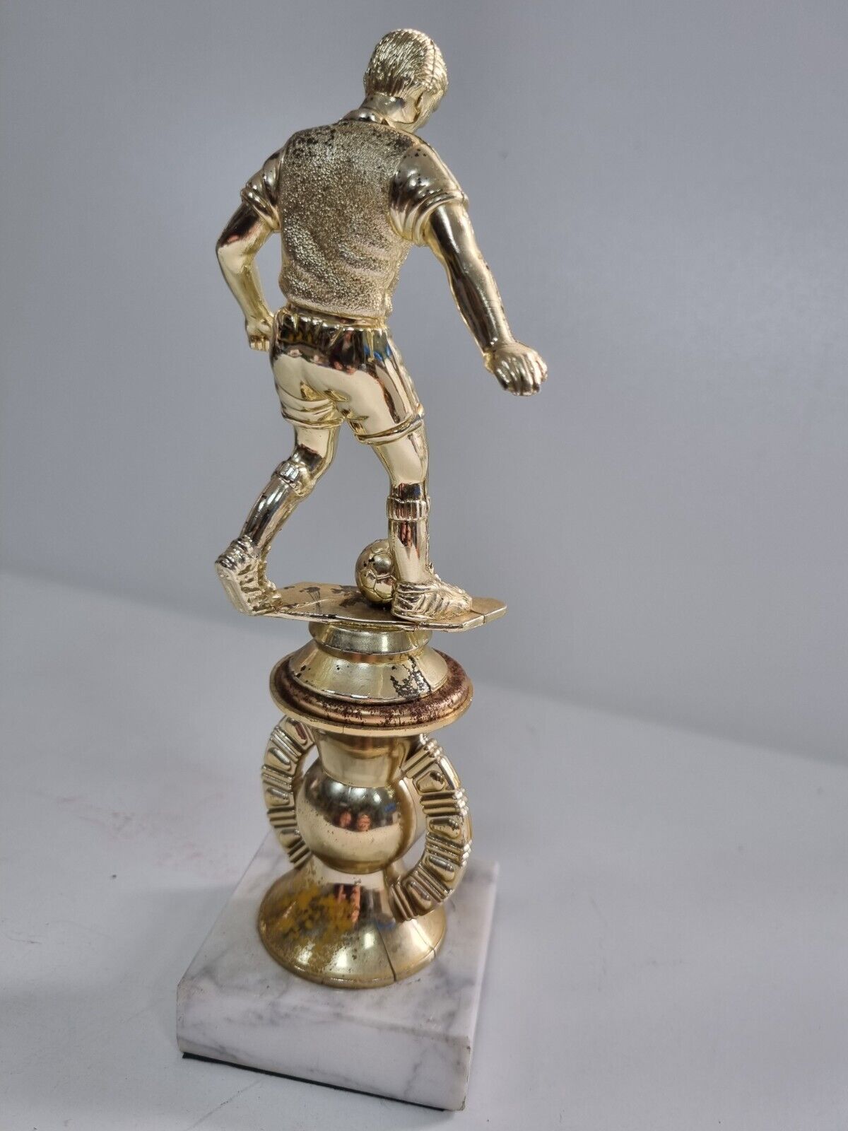 On offer for sale is Chingford Sirloin League Champions 1997/98 Trophy on Marble Base. Size approximately 21.5 cm x 4.5cm This Trophy has rusted a little where the ball is based, otherwise remains in good condition but showing genuine signs of age… Please study pictures carefully to decide.