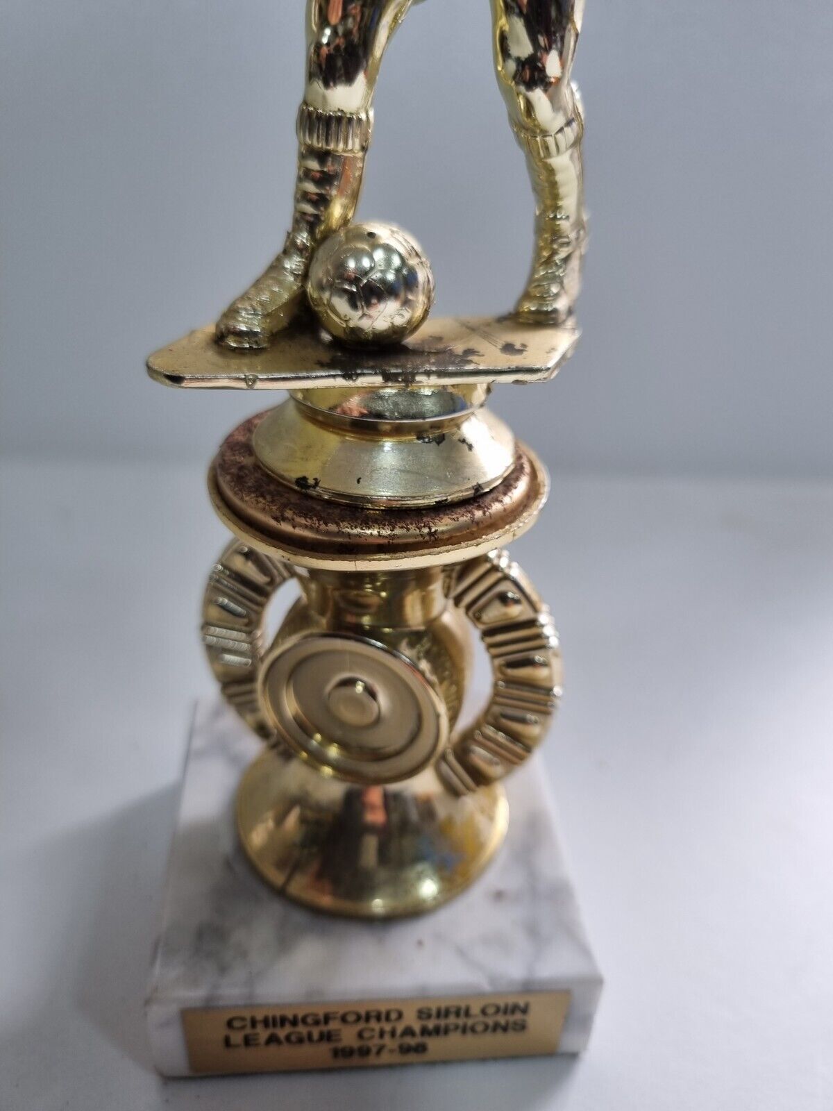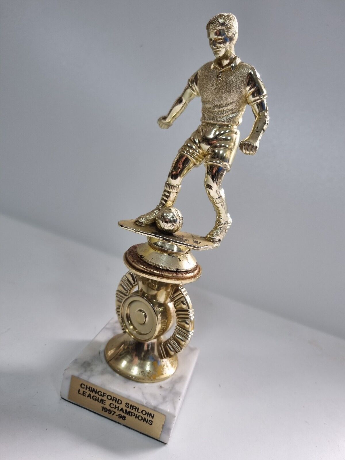"On offer for sale is Chingford Sirloin League Champions 1997/98 Trophy on Marble Base. Size approximately 21.5 cm x 4.5cm This Trophy has rusted a little where the ball is based, otherwise remains in good condition but showing genuine signs of age... Please study pictures carefully to decide."