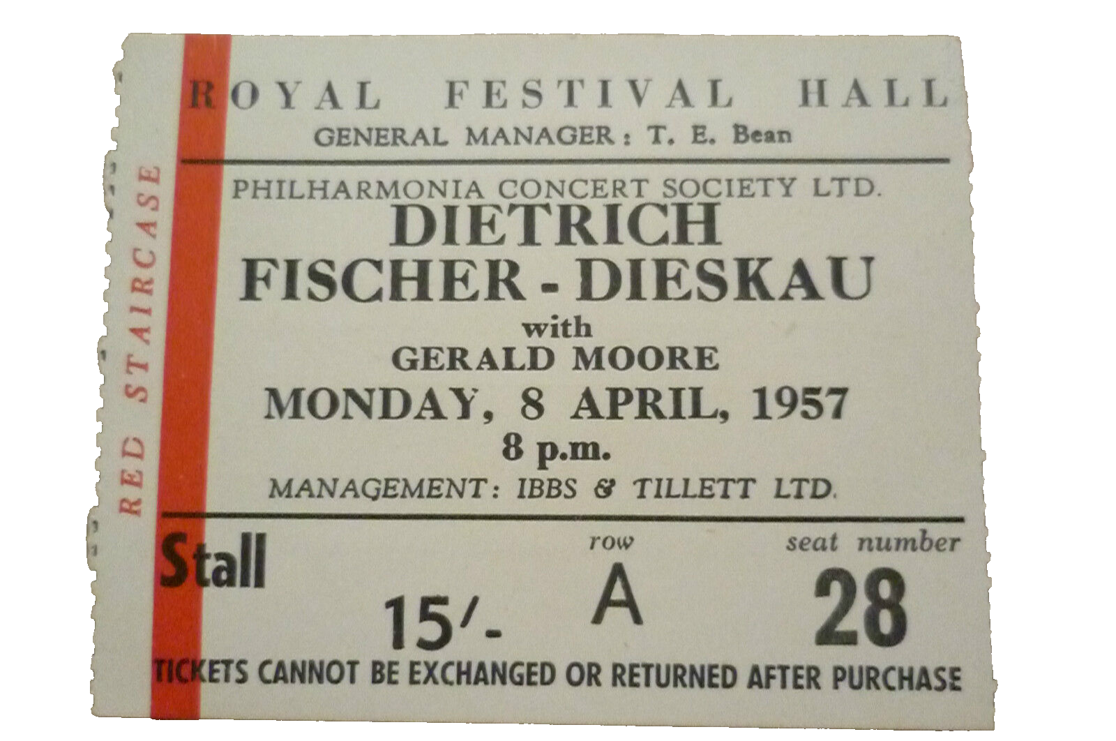 You are purchasing an original & vintage : CONCERT TICKET 1957- Recital by DIETRICH FISCHER DIESKAU