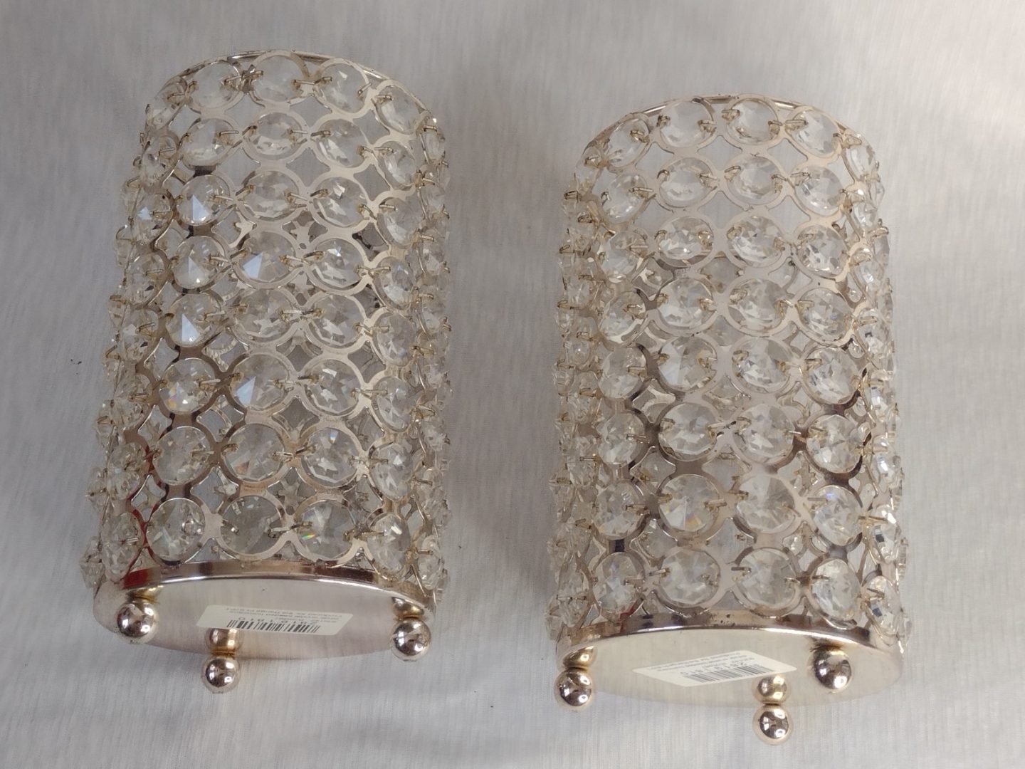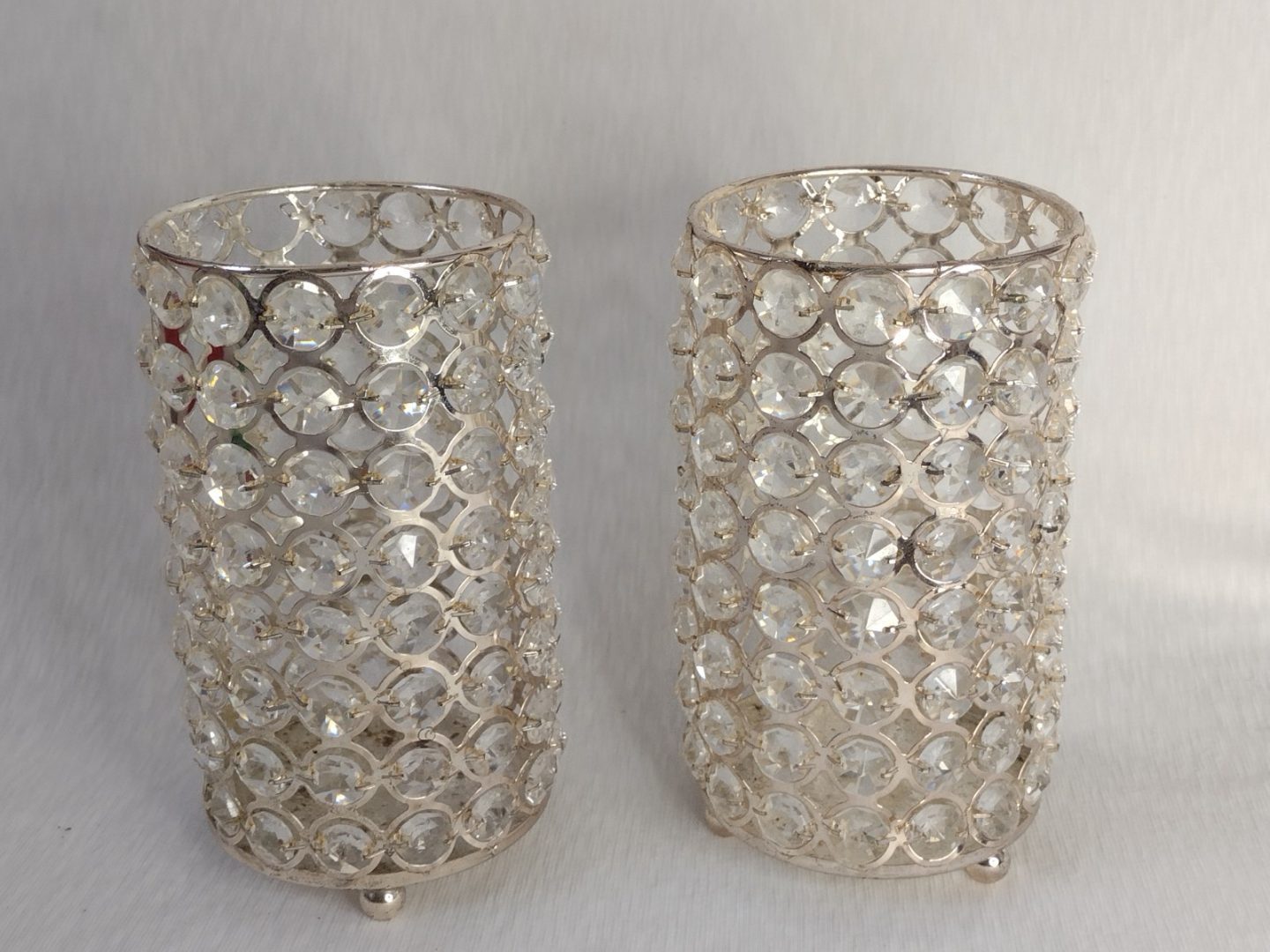 Crystal Candle Holders Silver Glass Crystal Beaded Hurricane 17.5cm Pair Vintage