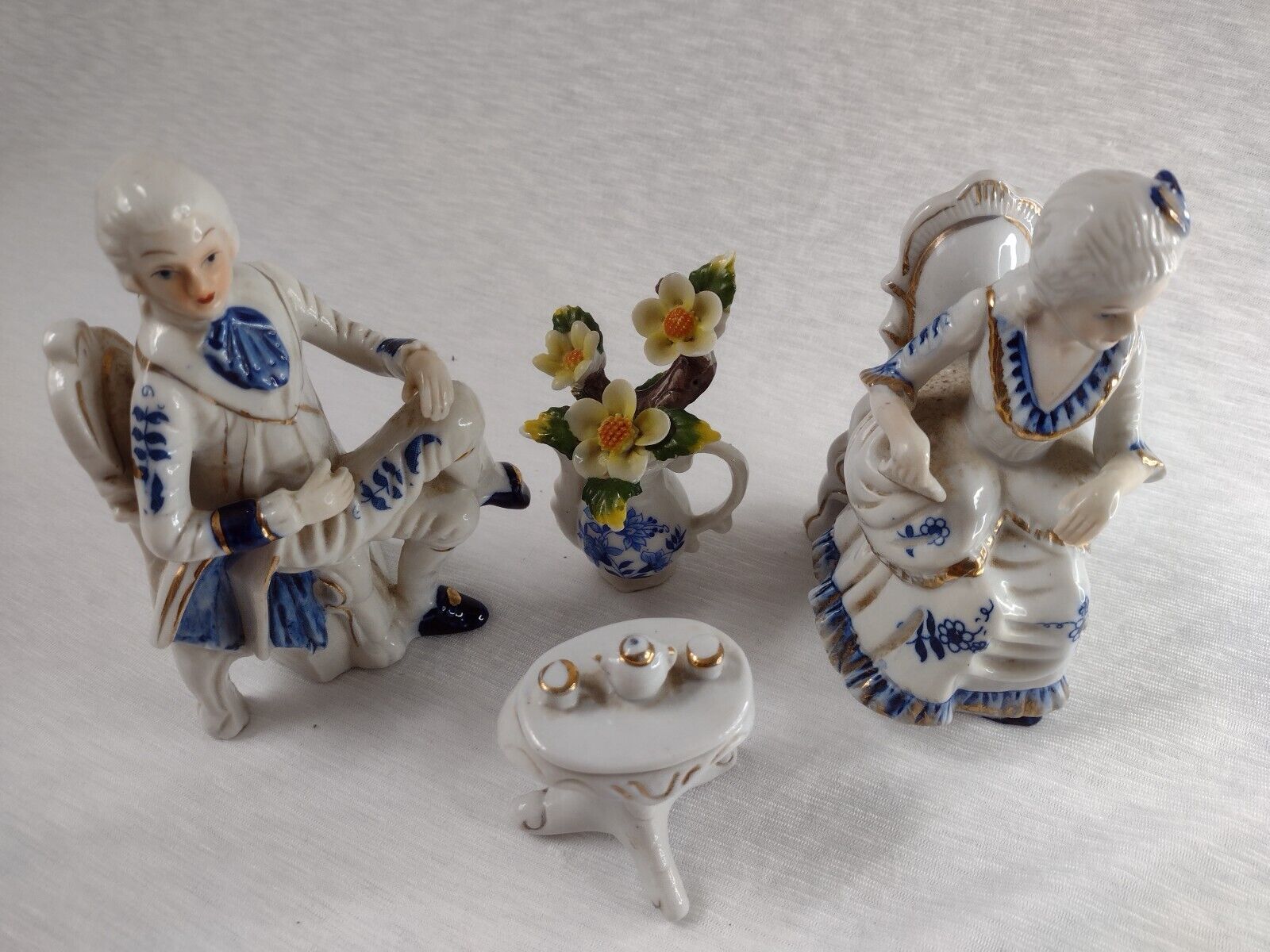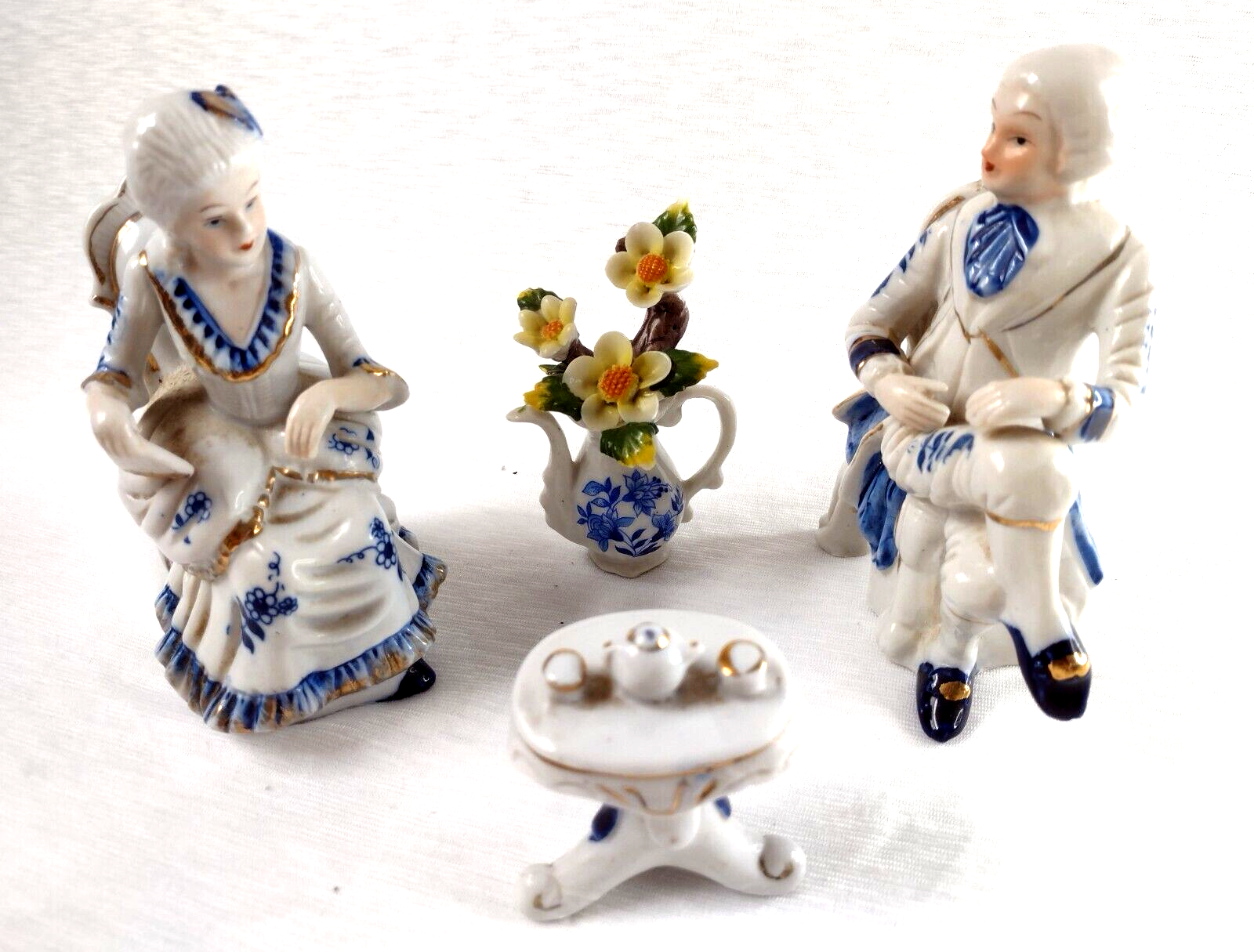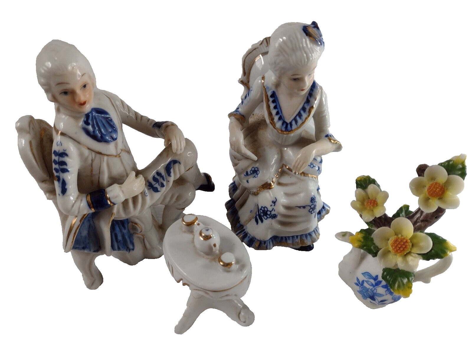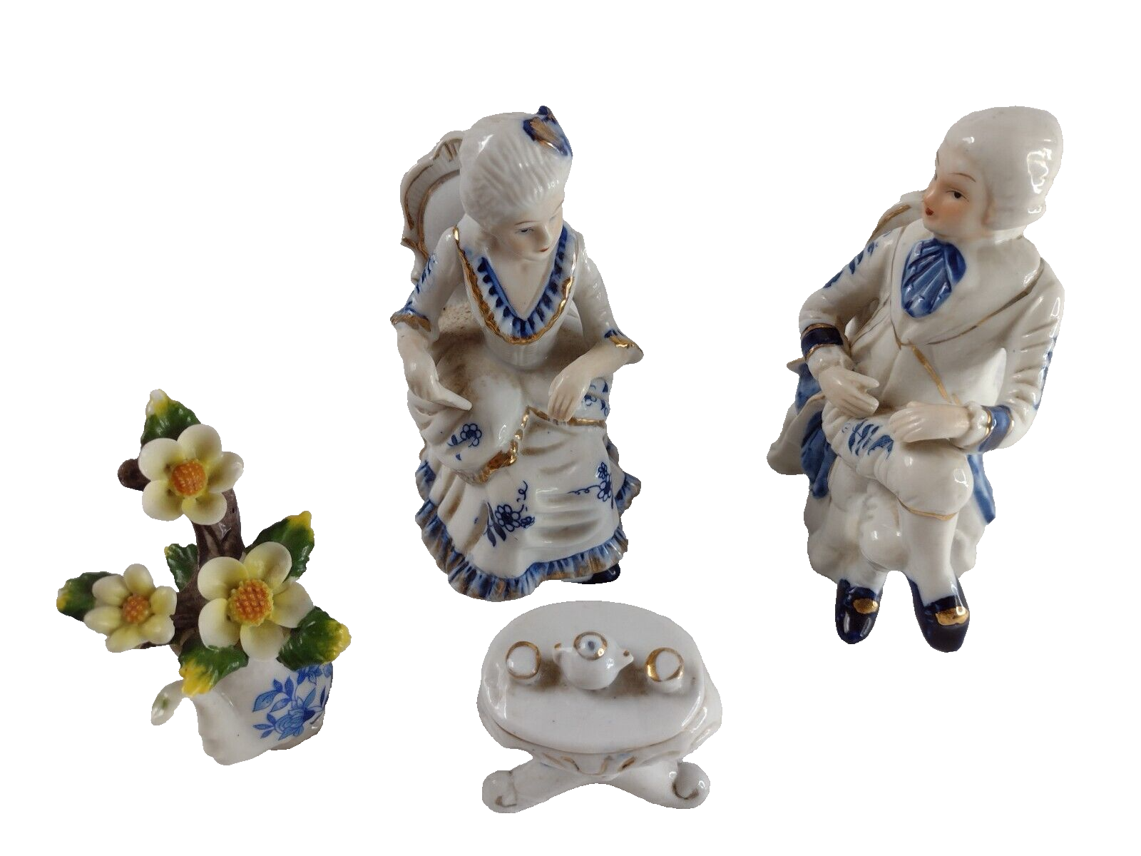 Deville Colonial Gold Gentleman & Lady & Teapot Vase Flower Blue White Porcelain