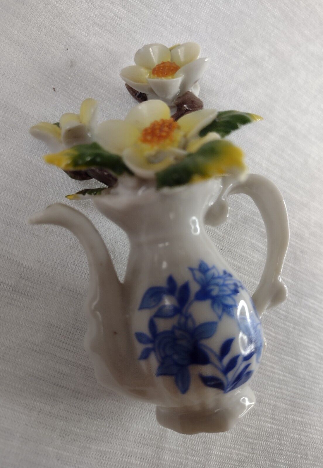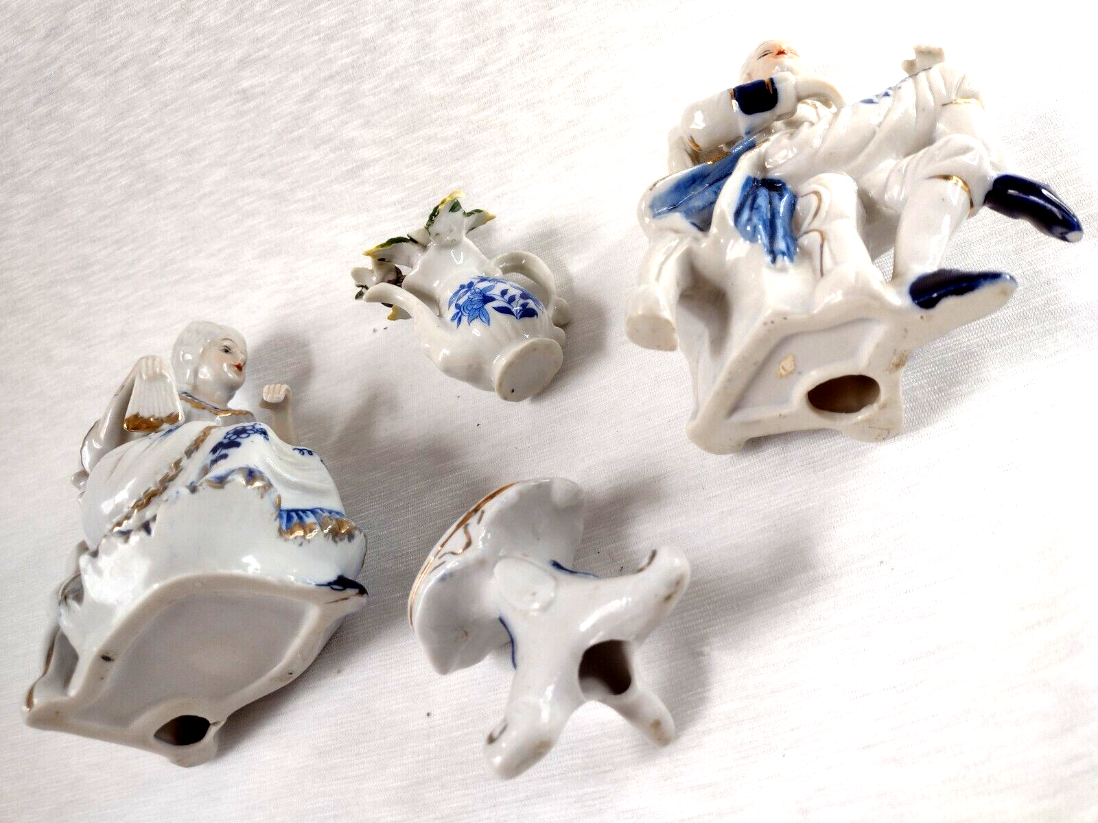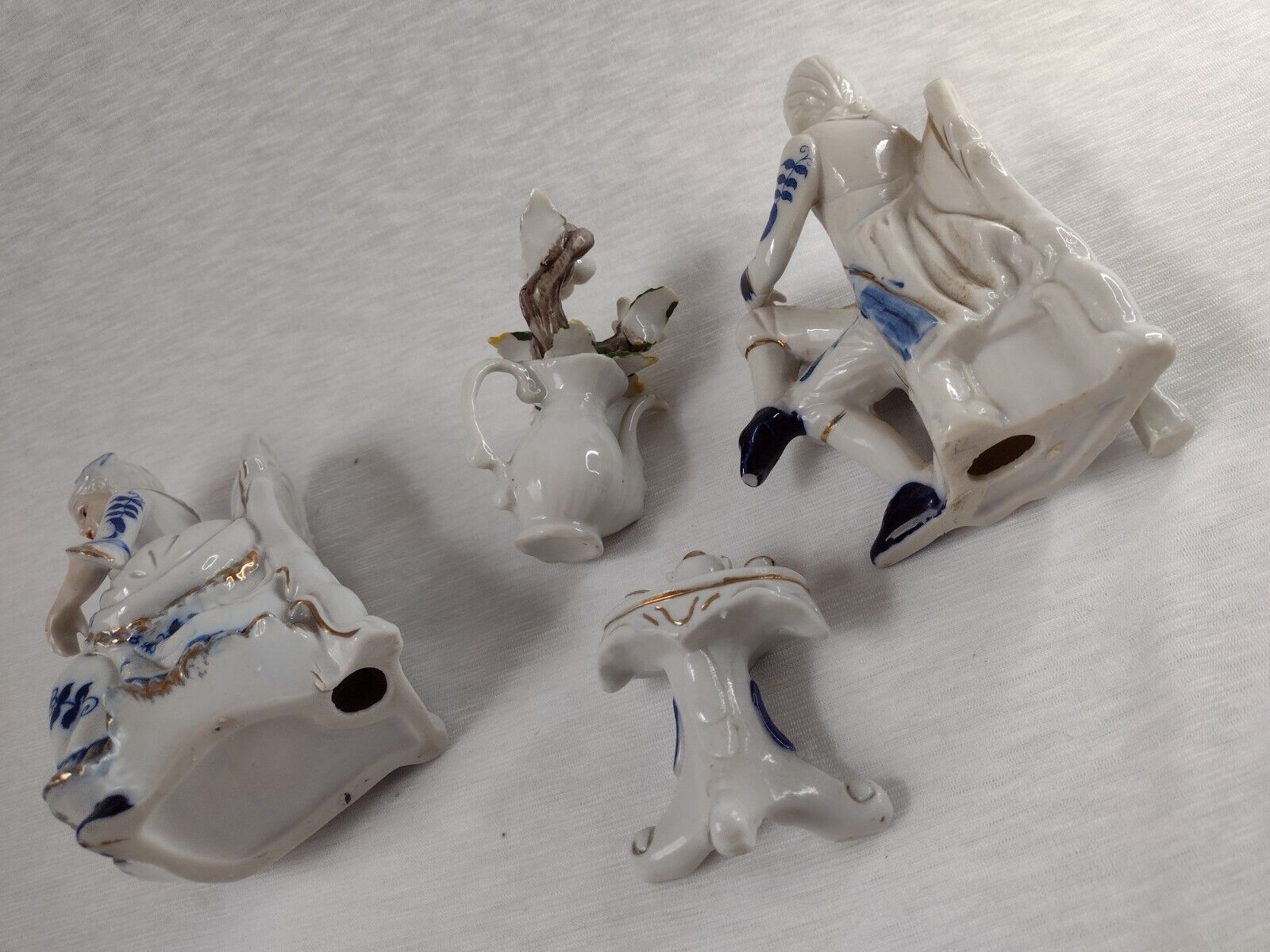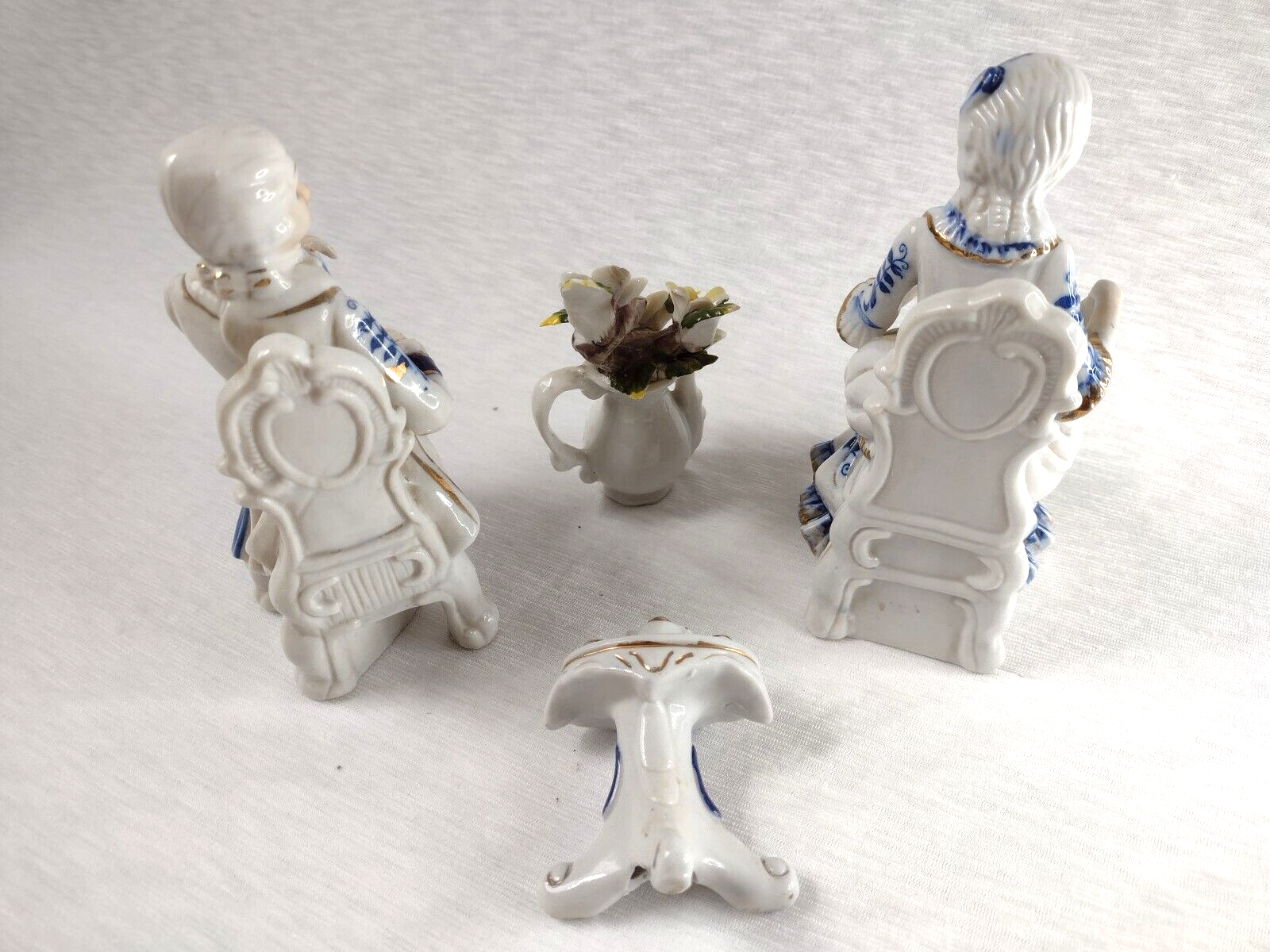 Deville Colonial Gold Gentleman & Lady & Teapot Vase Flower Blue White Porcelain