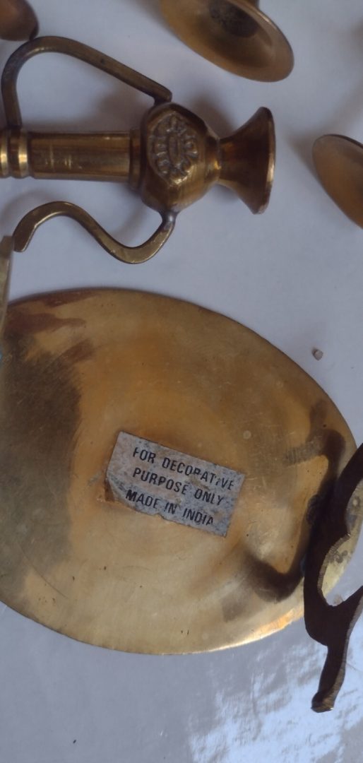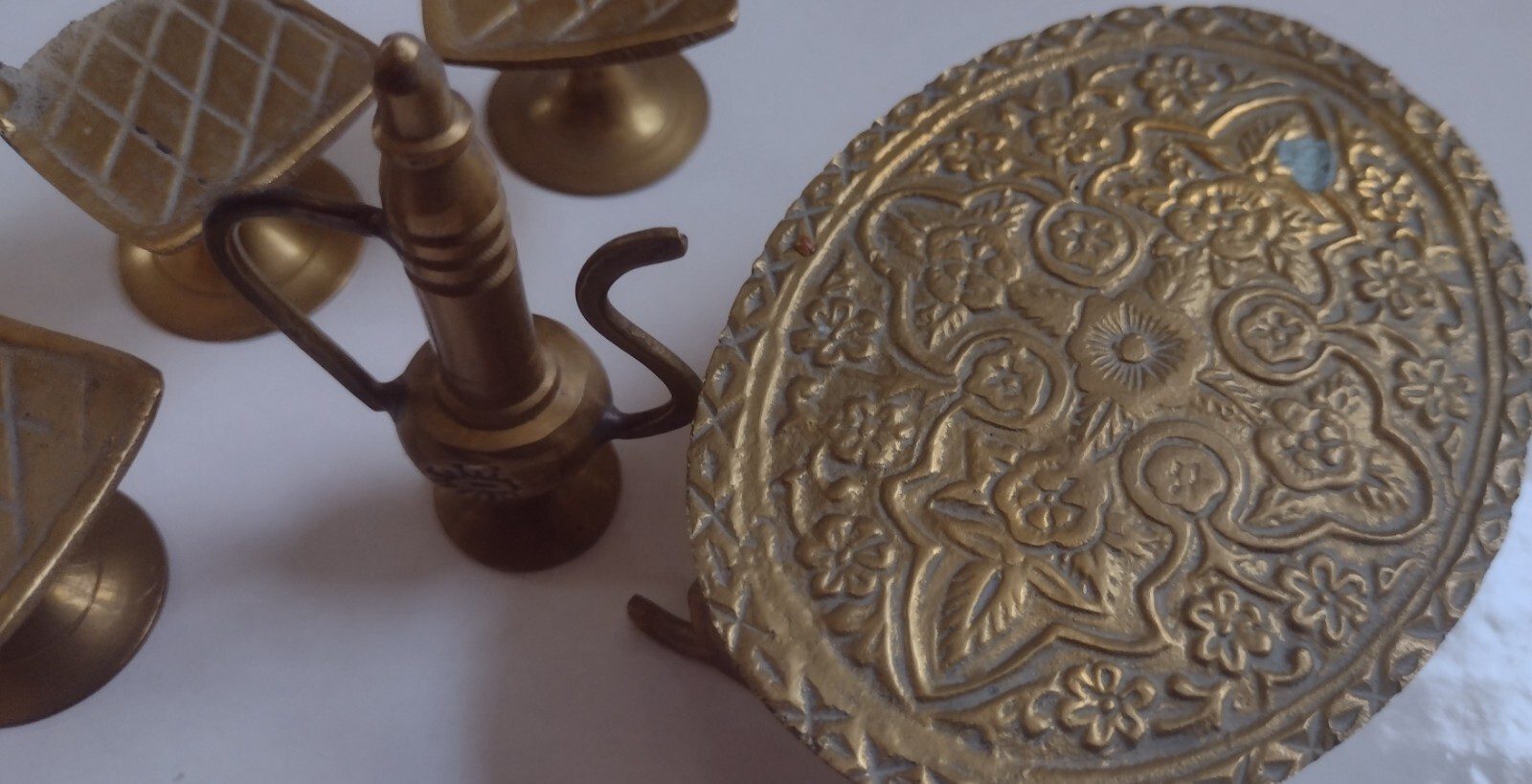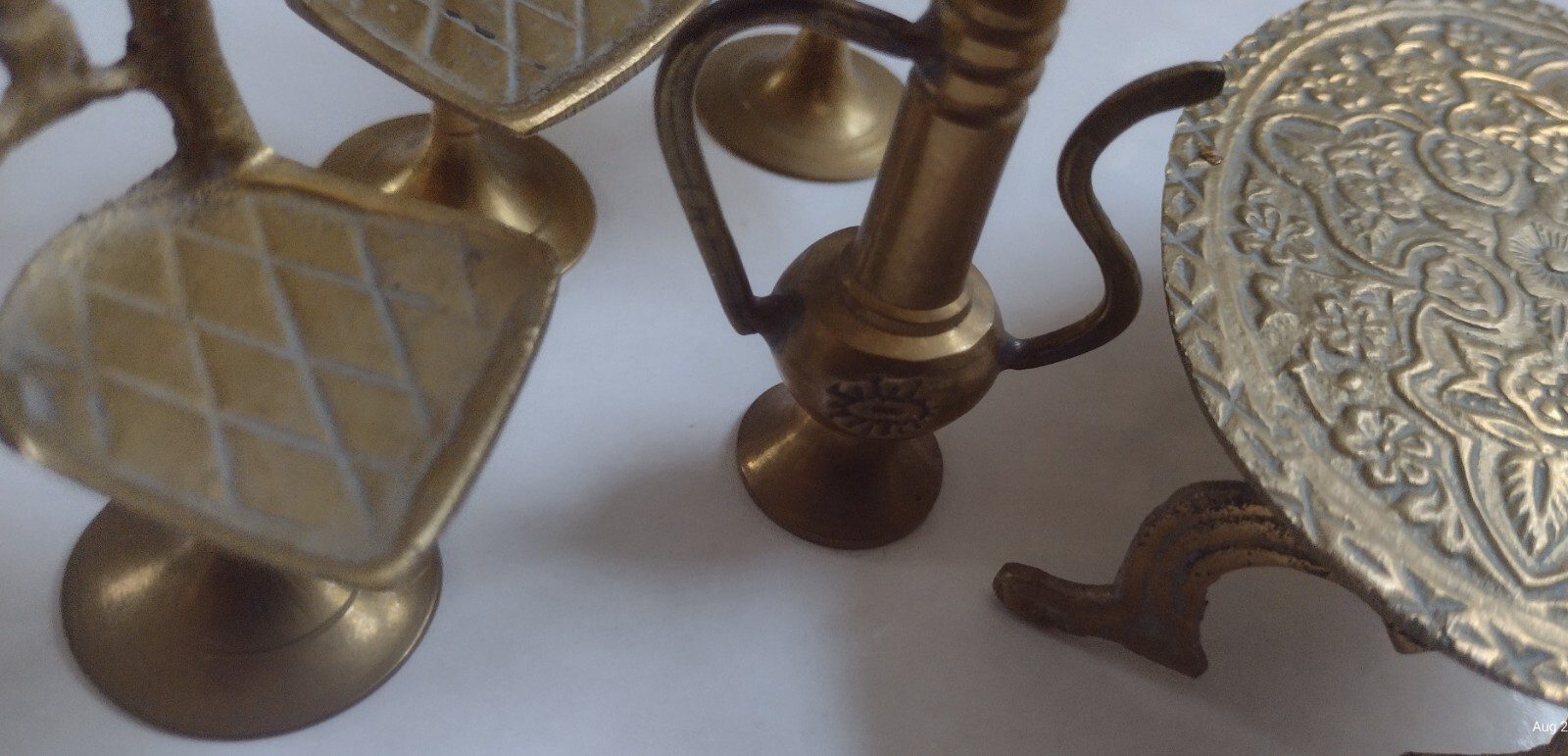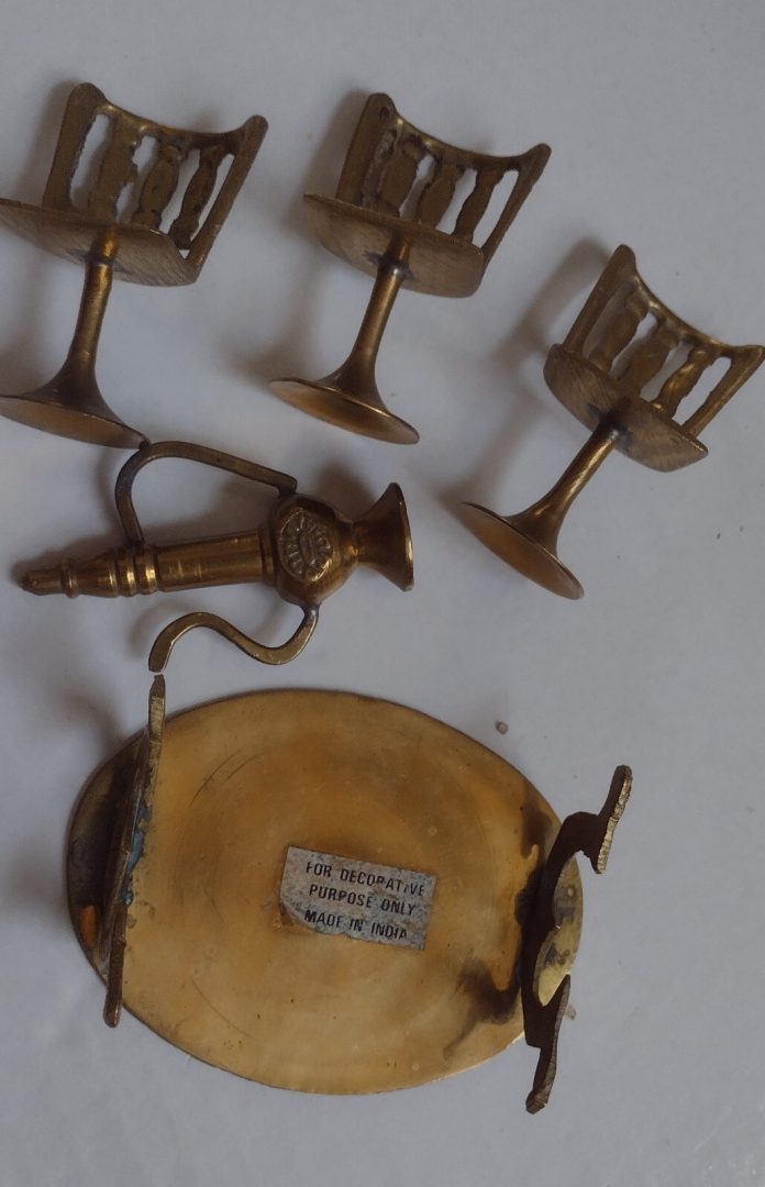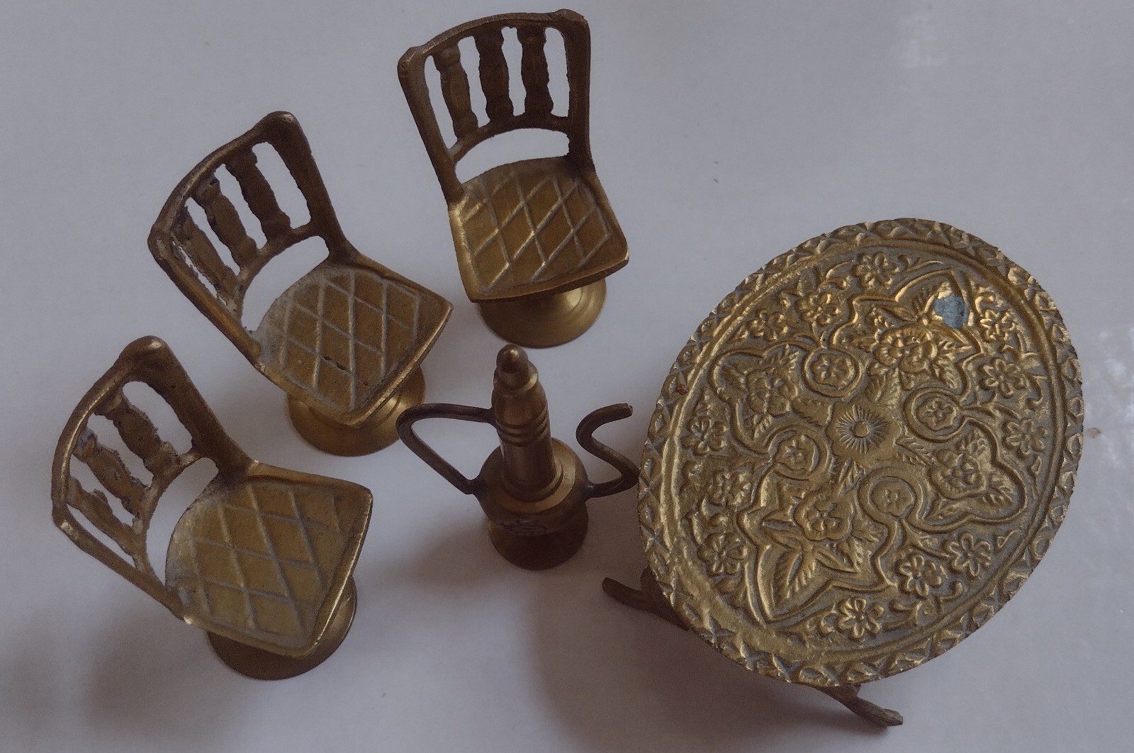 "All Brass, Made in India marked.(Size approximately Table 92 mm & 66 mm High 29 mm , chair 60 mm x 32 mm, Serving vast 64 mm x 38 mm total 5 pcs...) Doll House Table Chairs & Serving vast.. Doll House Miniatures for Collection Fairy Garden Display India Coffee Pitcher Chalices."